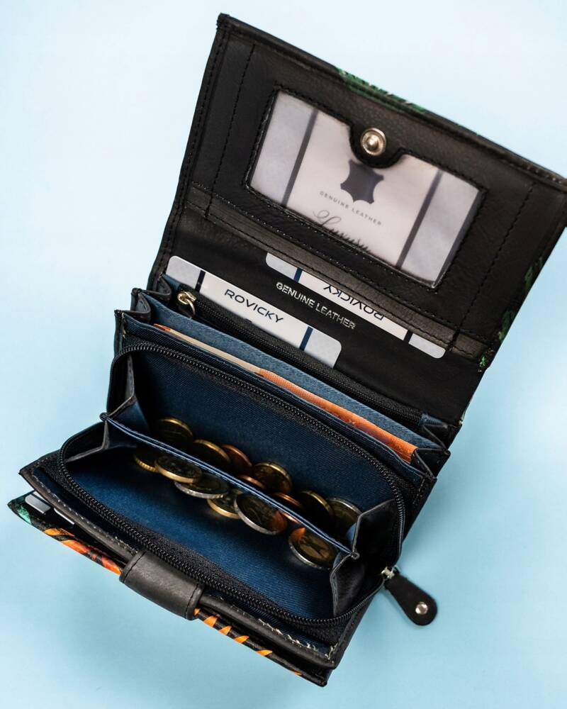 Dzięki sporej ilości schowków portfel znacząco ułatwi Ci segregacje gotówki. Jeśli potrzebujesz przechowywać kilka walut, możesz bez problemu je rozdzielić.