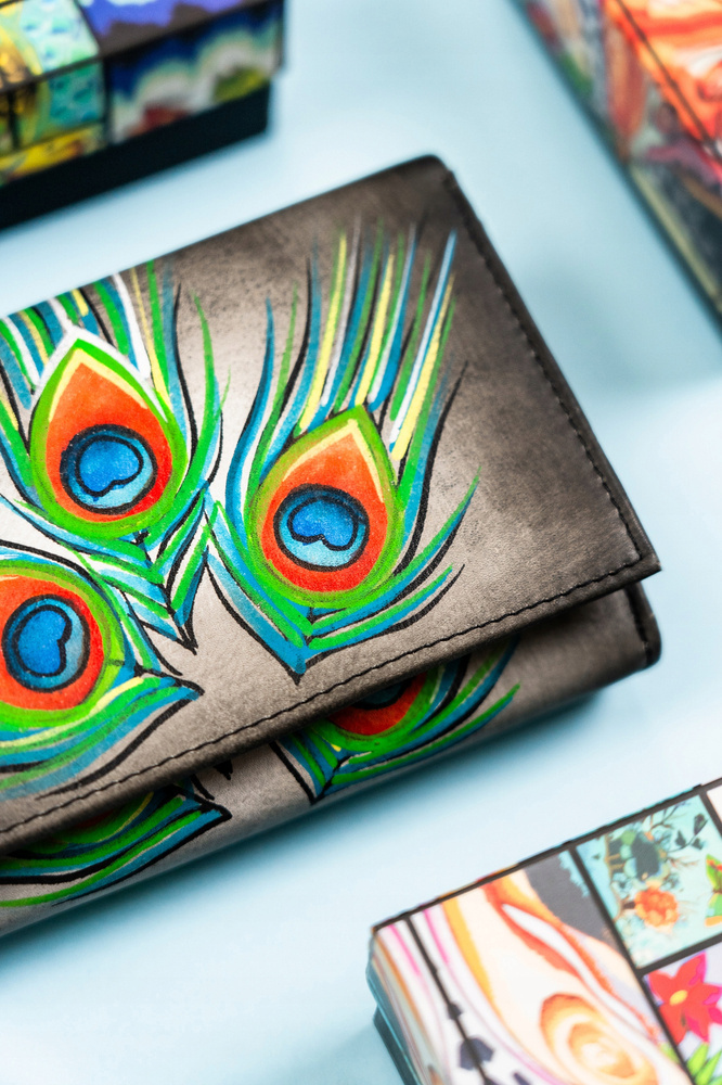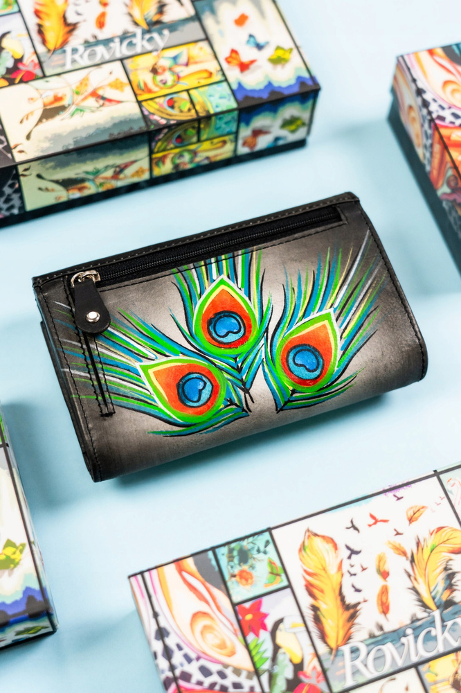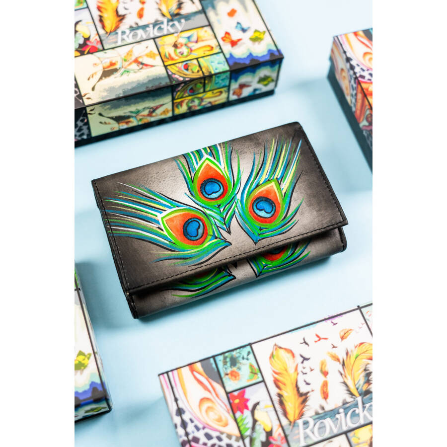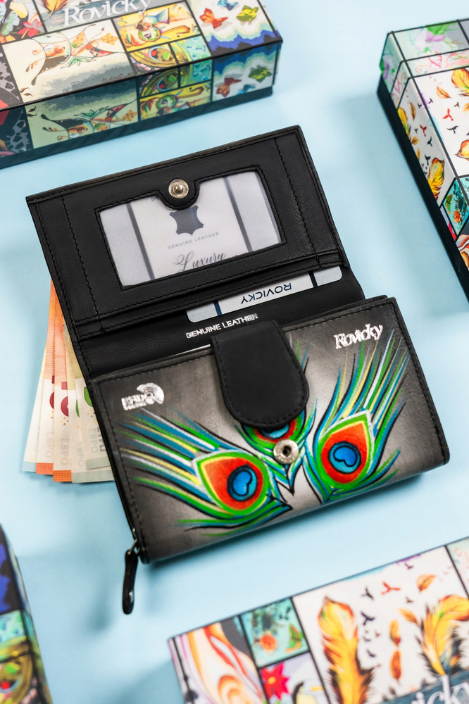 Pojemny, skórzany portfel damski na zatrzask ze wzorem pawich piór – Rovicky