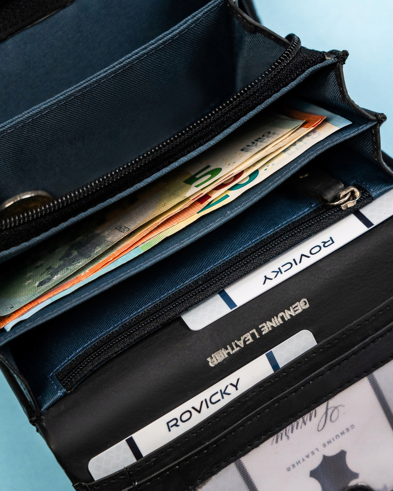 Dzięki sporej ilości schowków portfel znacząco ułatwi Ci segregacje gotówki. Jeśli potrzebujesz przechowywać kilka walut, możesz bez problemu je rozdzielić.