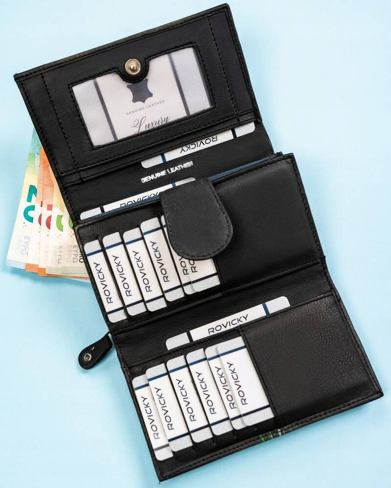 - 3 obszerne przegródki na banknoty, pomieszczą sporą ilość gotówki.
