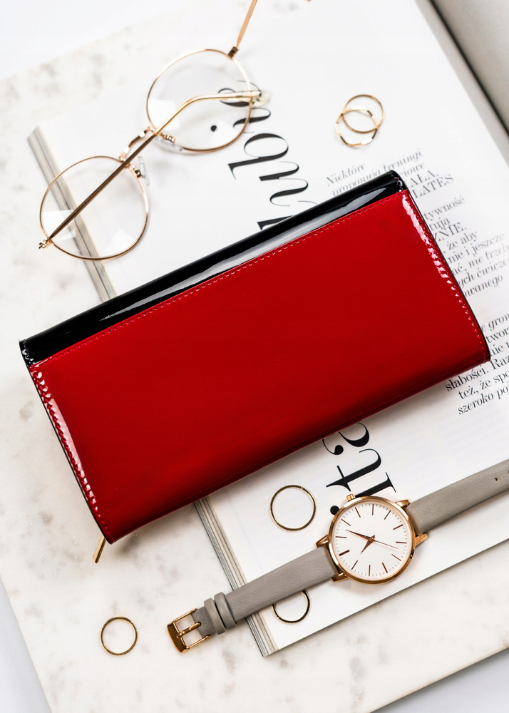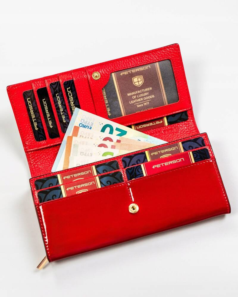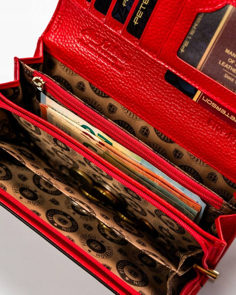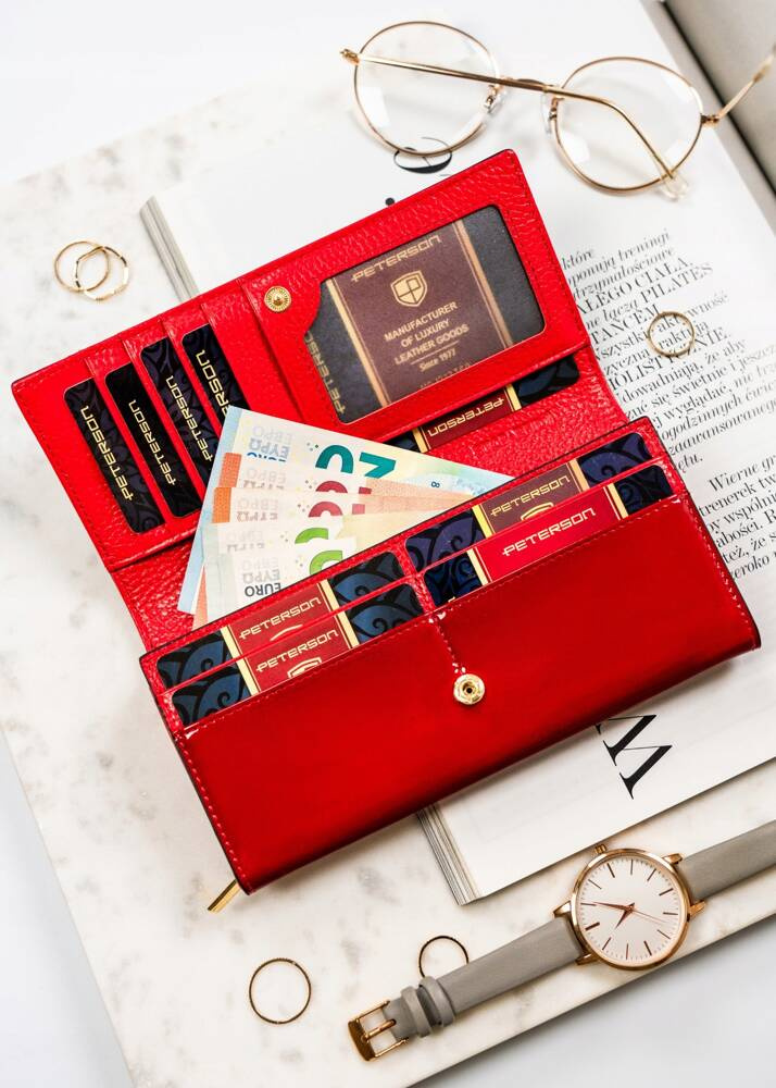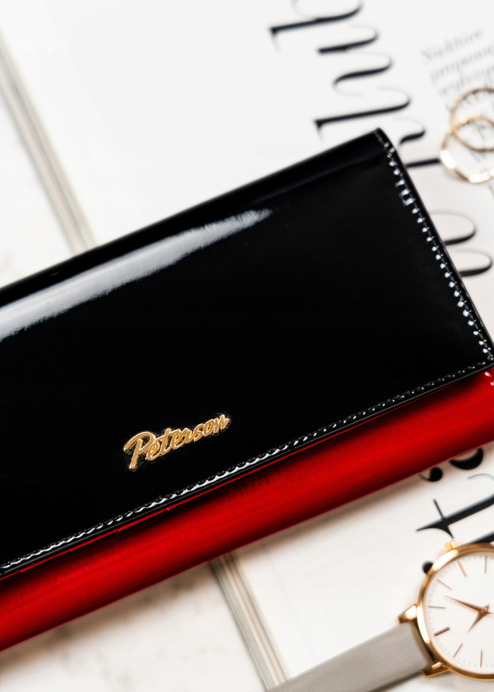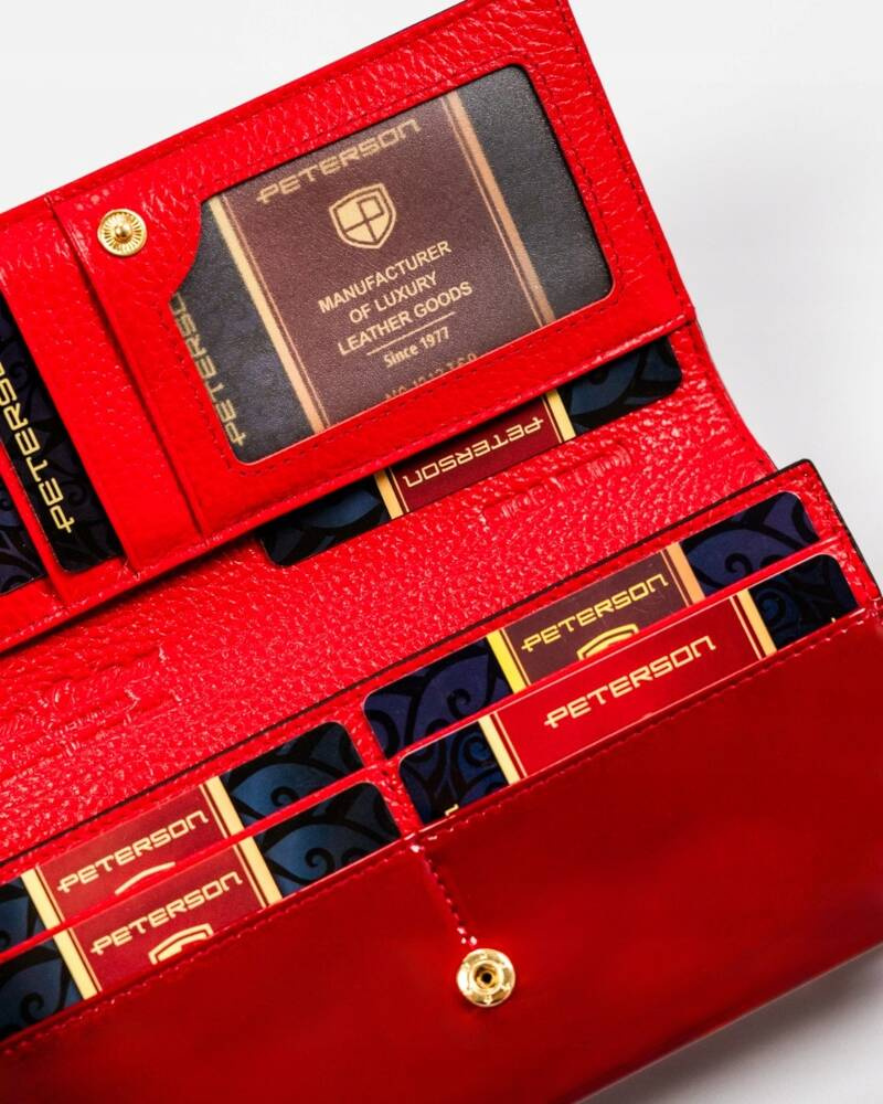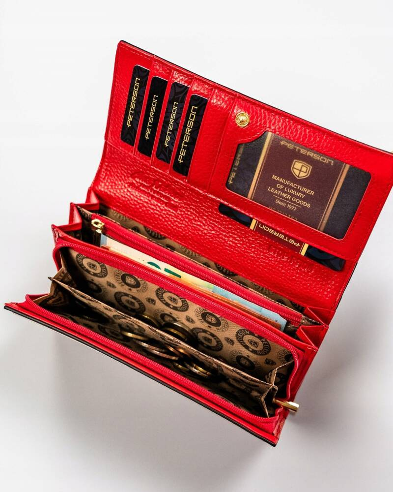 Pojemny, skórzany portfel damski z systemem RFID w czarno-czerwonym kolorze – Peterson