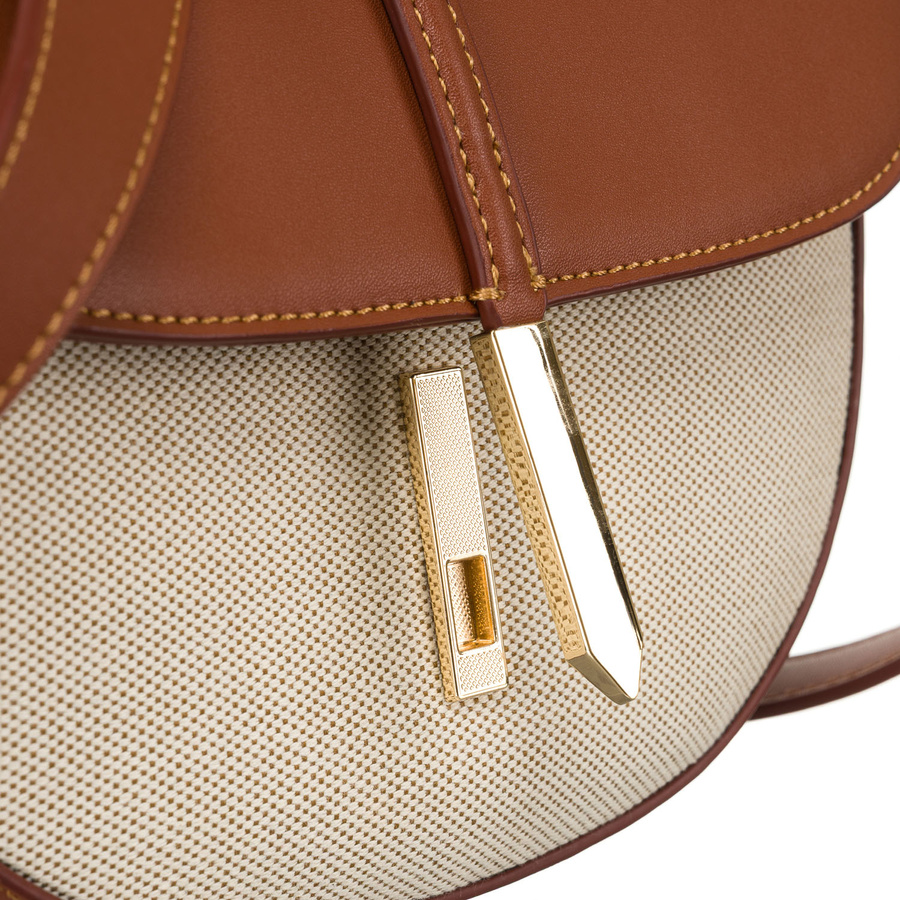 Półokrągła beżowo – brązowa listonoszka damska ze skóry naturalnej i płótna canvas Peterson