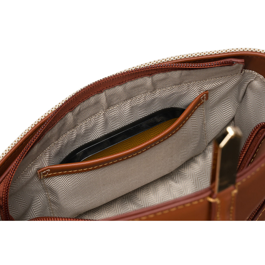 Półokrągła beżowo - brązowa listonoszka damska ze skóry naturalnej i płótna canvas PetersonPółokrągła beżowo – brązowa listonoszka damska ze skóry naturalnej i płótna canvas Peterson
