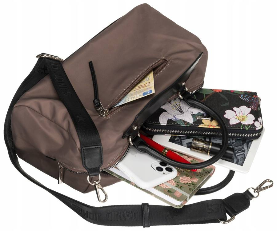 Pojemna torebka w klasycznym stylu. Ma 1 komorę główną, której wnętrze wyposażono w 2 kieszonki (jedna jest zamykana na suwak, druga otwarta). Na froncie torebki wyszyto 1 bardzo wygodną kieszeń, która dedykowana jest na drobiazgi.