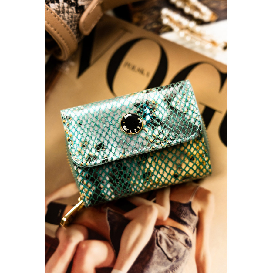 • Skóra naturalna | Jego głównym elementem jest tekstura przypominająca siatkę w odcieniu niebieskim, co sprawia, że tło z mieniącymi się złotymi i szarymi akcentami przypomina wężową skórę. Portfel ma elegancki, połyskujący wygląd, co nadaje mu luksusowego charakteru. Na przedniej części widoczny jest błyszczący, elegancki emblemat, który dodatkowo podkreśla markowy charakter produktu. Zapięcie suwaka ozdobione piękną, złotą zawieszką z logo.