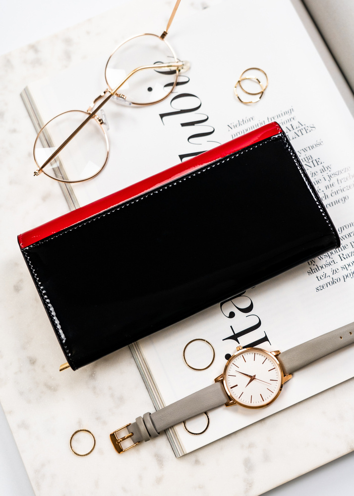 • Klasyczna konstrukcja | Portfel o orientacji poziomej, zamykany na zatrzask;
