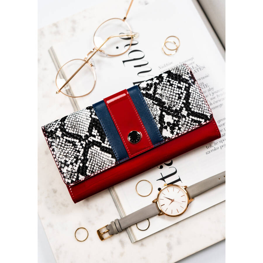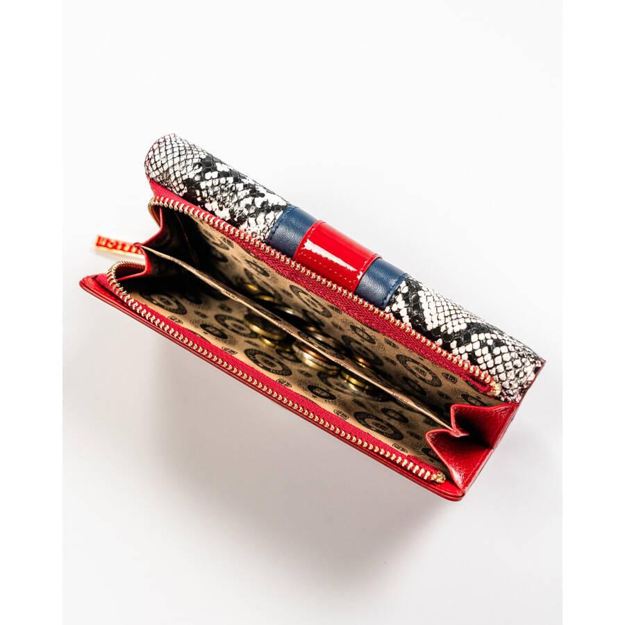 Portfel w klasycznym czerwonym kolorze, wykonany ze skóry naturalnej. Wyróżniającym się elementem jest wzór na klapie imitujący skórę węża. Czarno-białe łuski doskonale komponują się z granatowymi paskami oraz czerwonym, kontrastowym tłem.