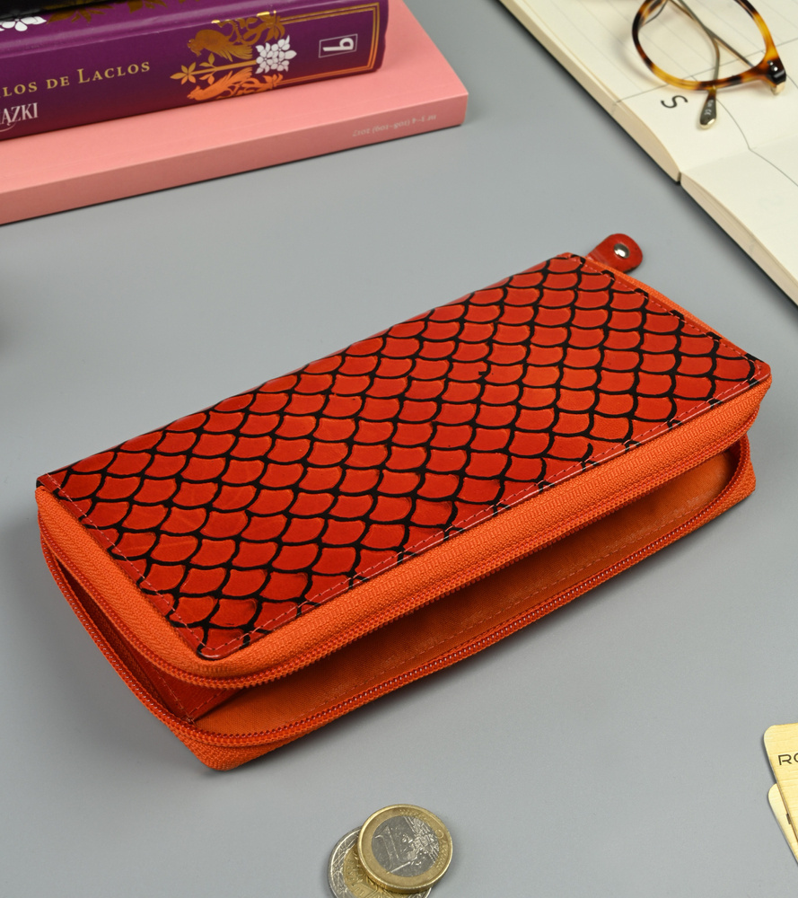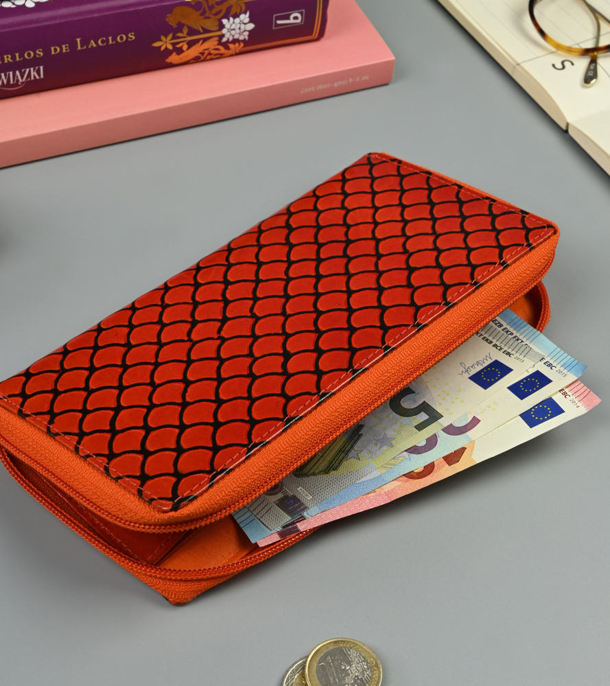 Portfel damski w typie piórnika ze zdobioną fakturą, skóra naturalna