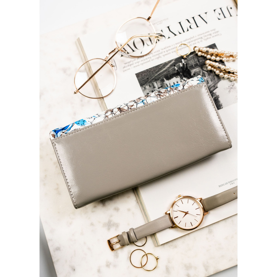 - Bogaty, kwiatowy motyw na froncie portfela przyciąga wzrok już od pierwszego spojrzenia. Błękitne kwiaty na białym tle tworzą artystyczny design, który podkreśla szykowny charakter tego dodatku.