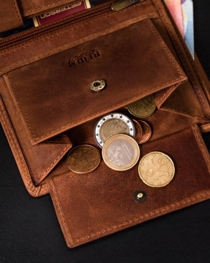 W kieszeniach na banknoty i monety zmieścisz satysfakcjonującą ilość gotówki.