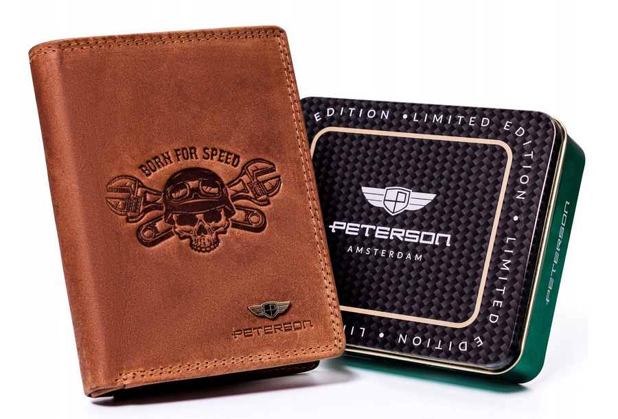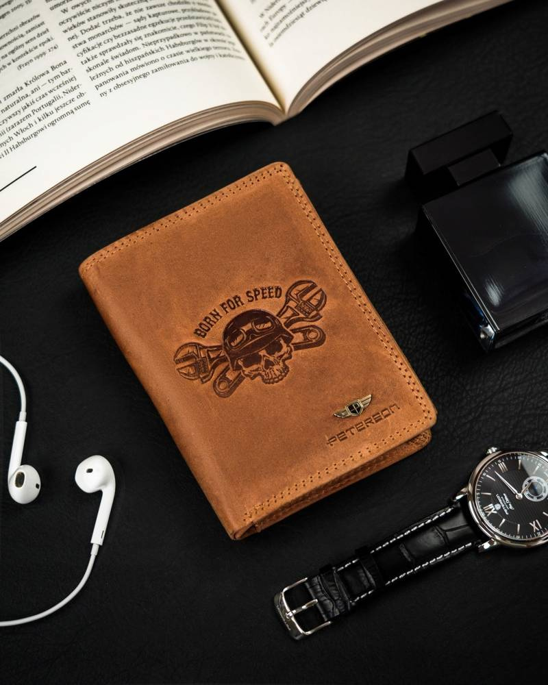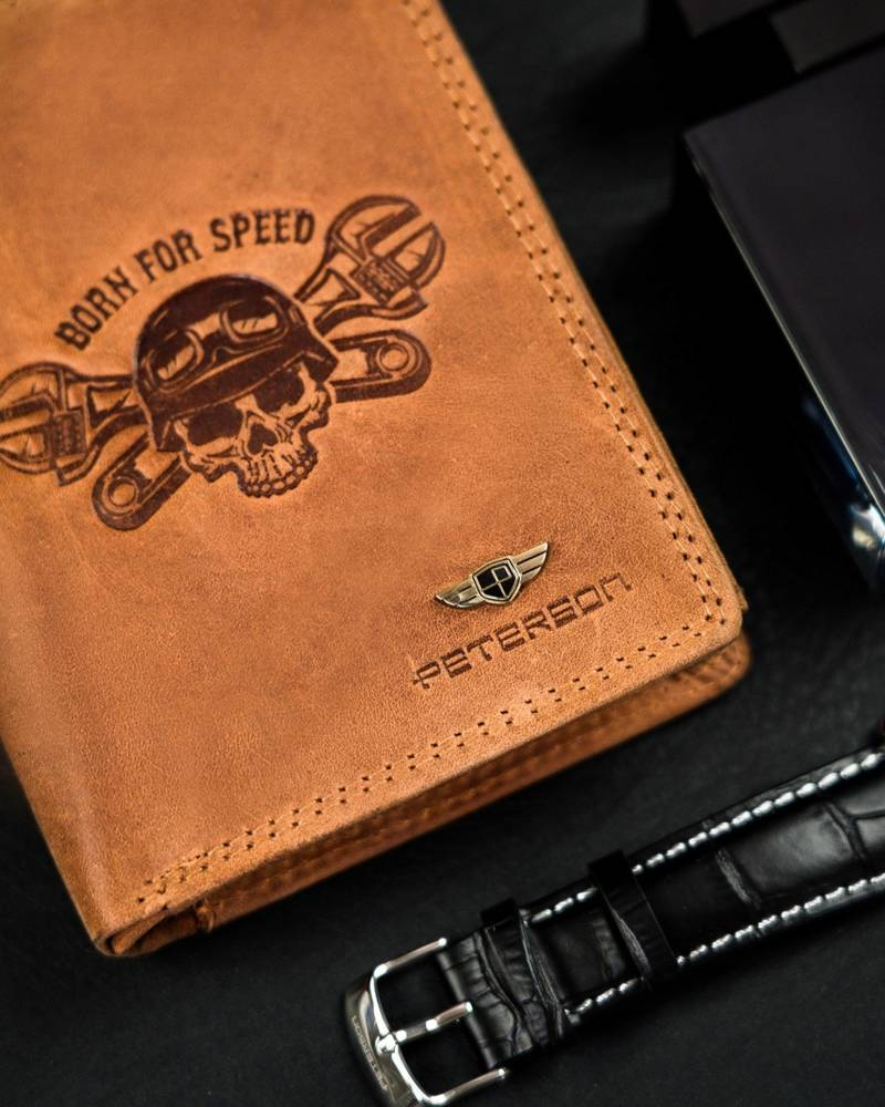- Portfel pasjonata motocykli | Na powierzchni portfela umieszczono wytłoczony wzór czaszki ze skrzyżowanymi kluczami oraz napisem „BORN FOR SPEED”;