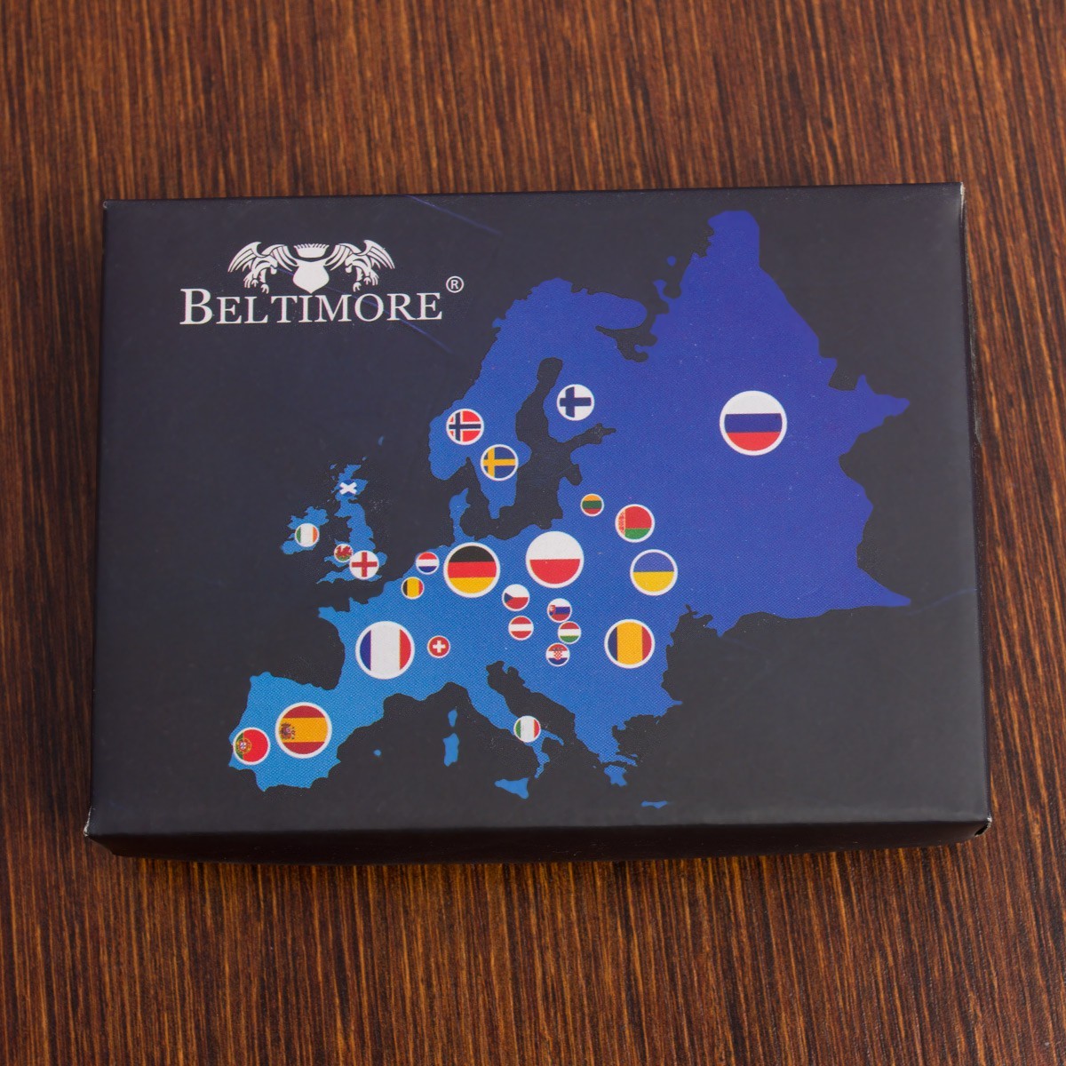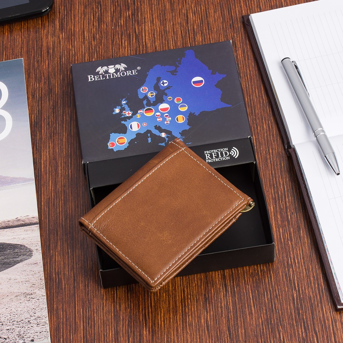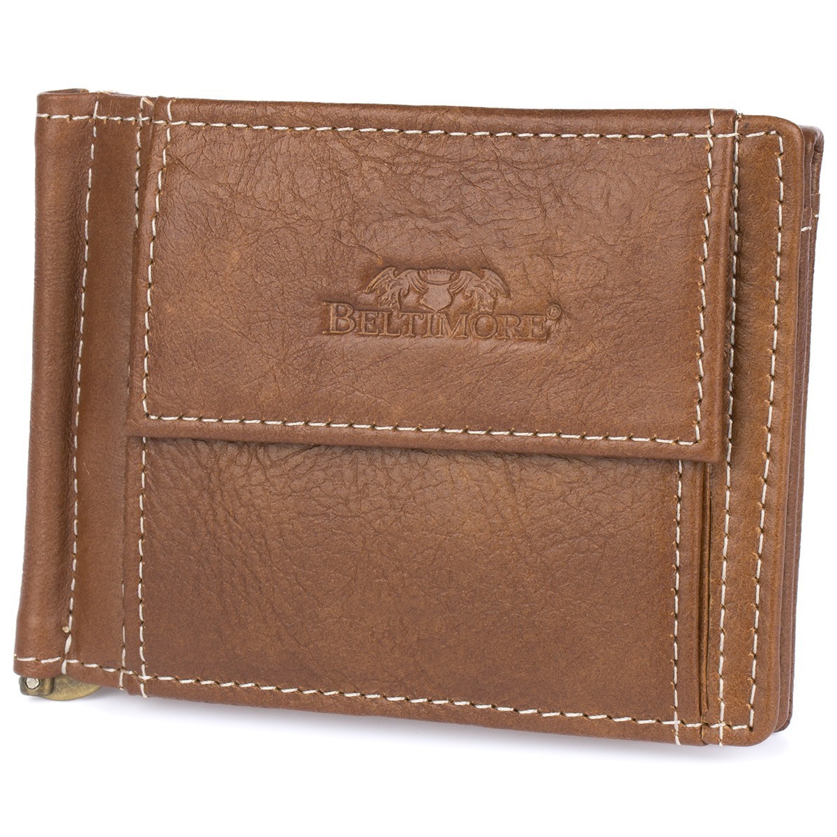 Renomowana marka Beltimore, w tej ofercie dostępny jest brązowy portfel, obszyty dookoła białą nicią.
