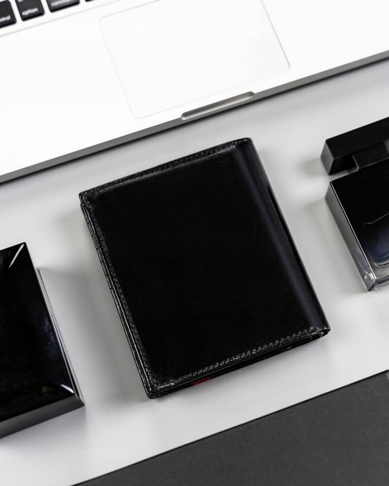 - Ogromna funkcjonalność w klasycznym wydaniu | Duży portfel męski w czarnym kolorze z czerwonym akcentem na froncie;