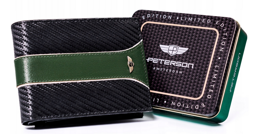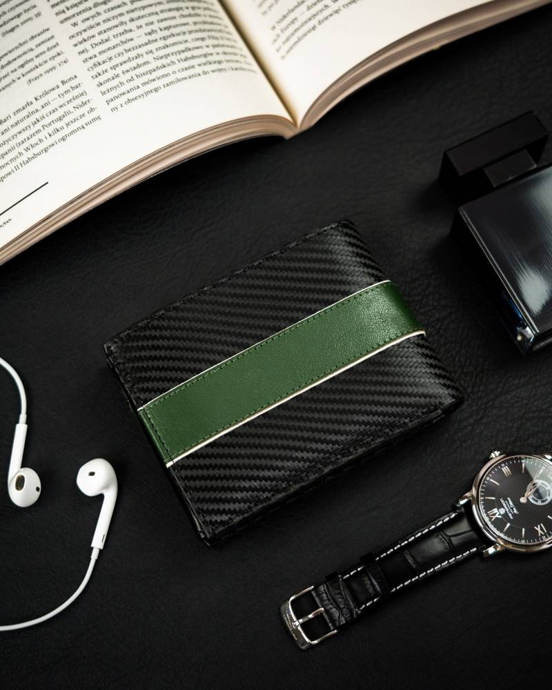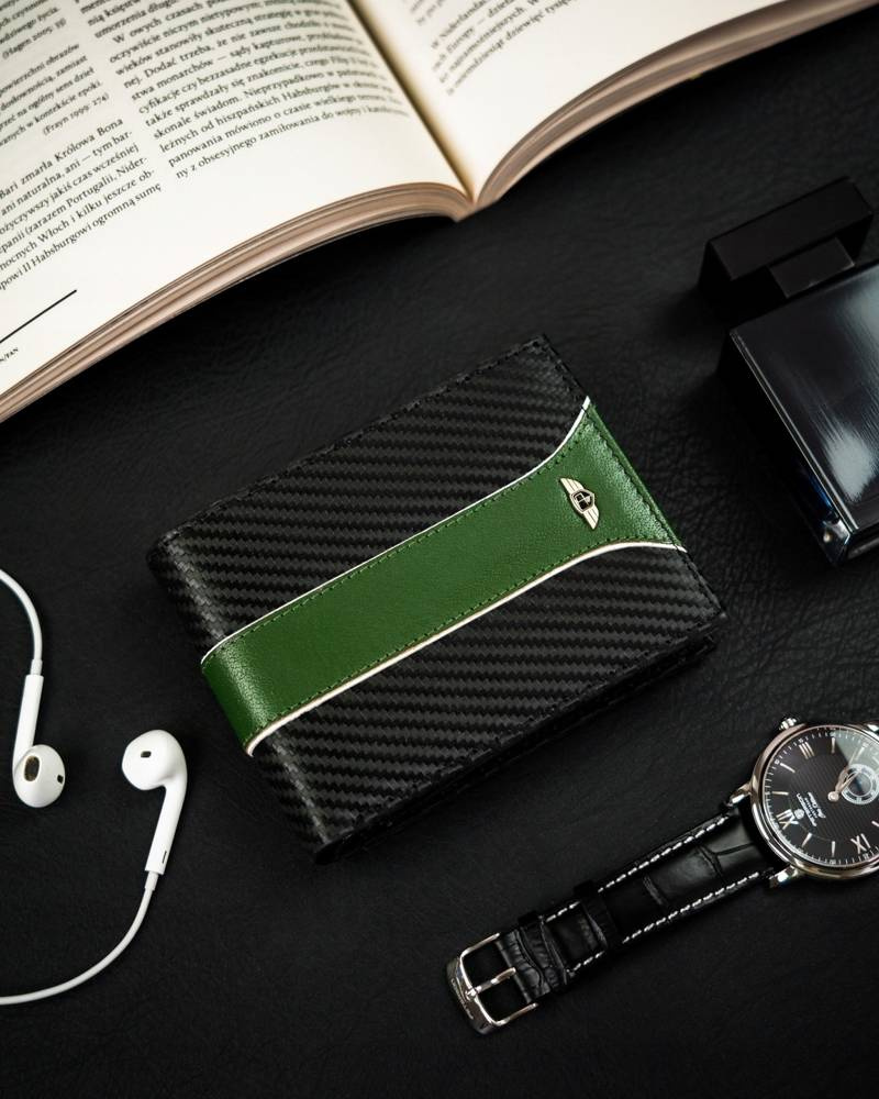 - Oszałamiający design | Portfel o klasycznym poziomym fasonie i rewelacyjnym wykończeniu – z zewnątrz powleczony warstwą do złudzenia przypominającą włókno węglowe (carbon), a dodatkowo ozdobiony zieloną wstawką, przeszytą przez całą jego szerokość;