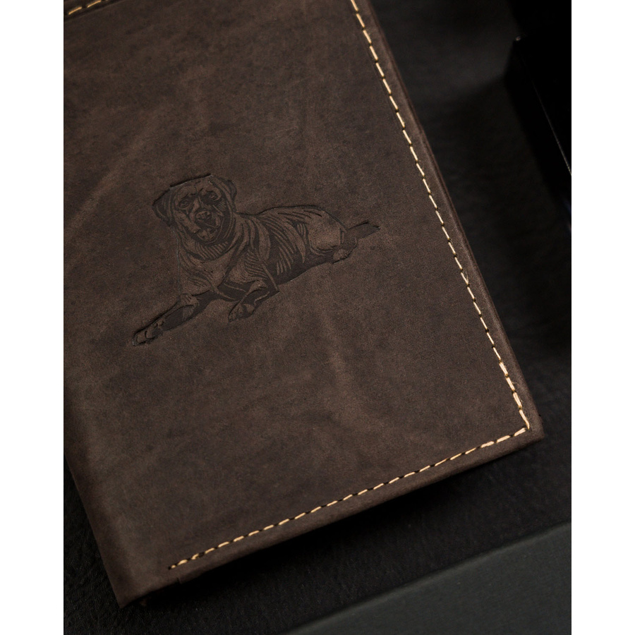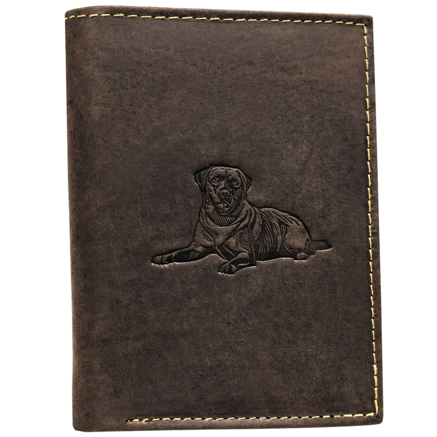 Ten wyjątkowy portfel wykonany został z naturalnej skóry o stylowym, lekko przecieranym wykończeniu. zdobiony eleganckim tłoczeniem przedstawiającym leżącego psa.