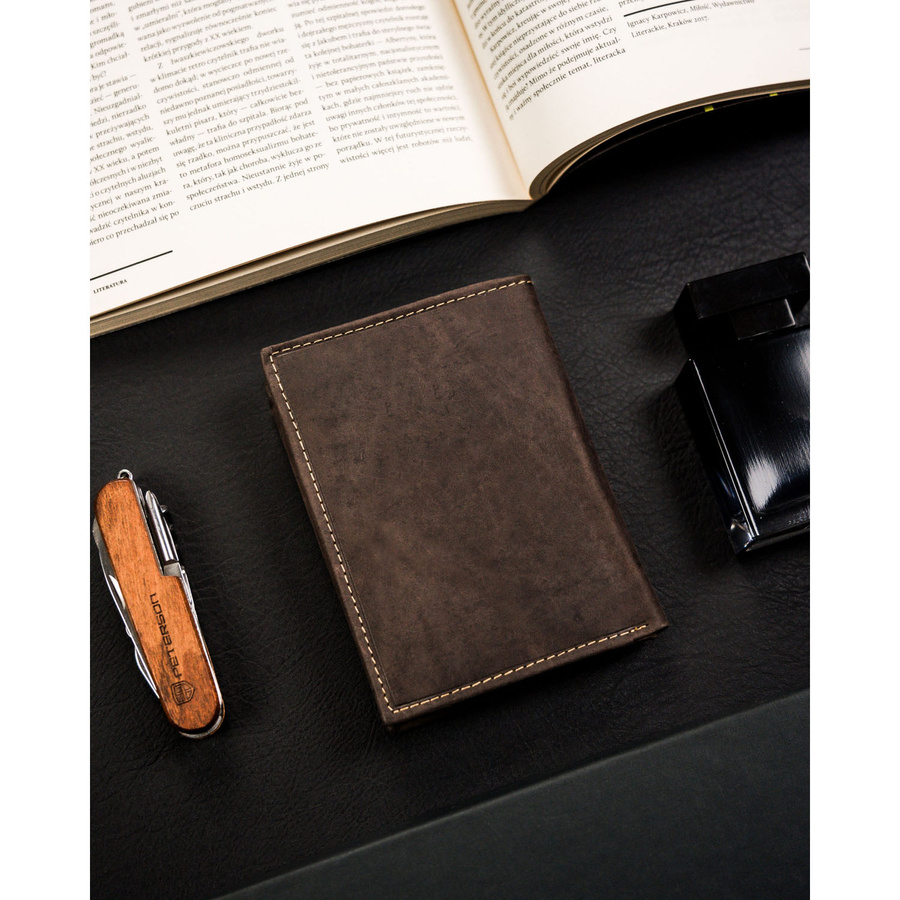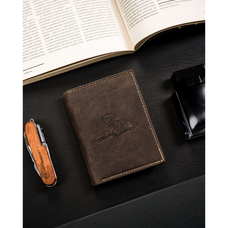 Portfel męski ze skóry naturalnej w brązowym kolorze z tłoczeniem w kształcie psa