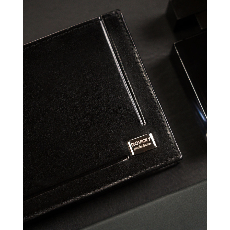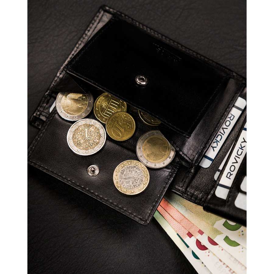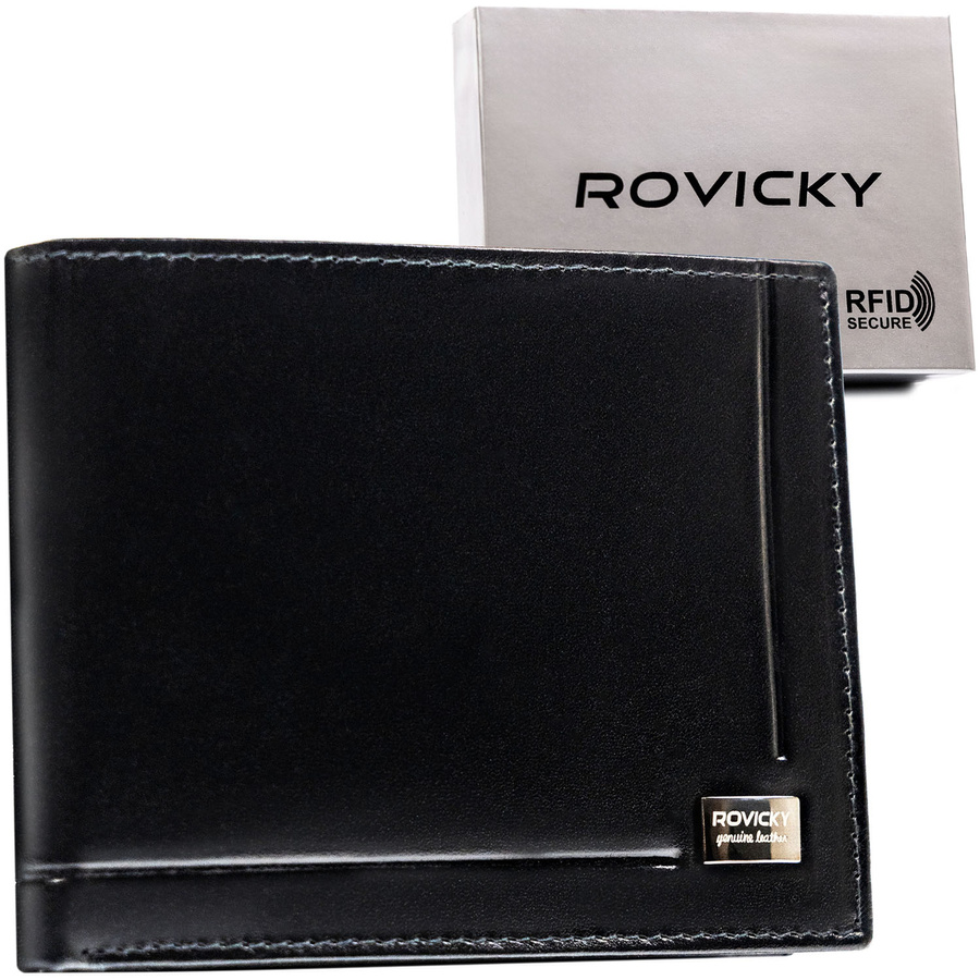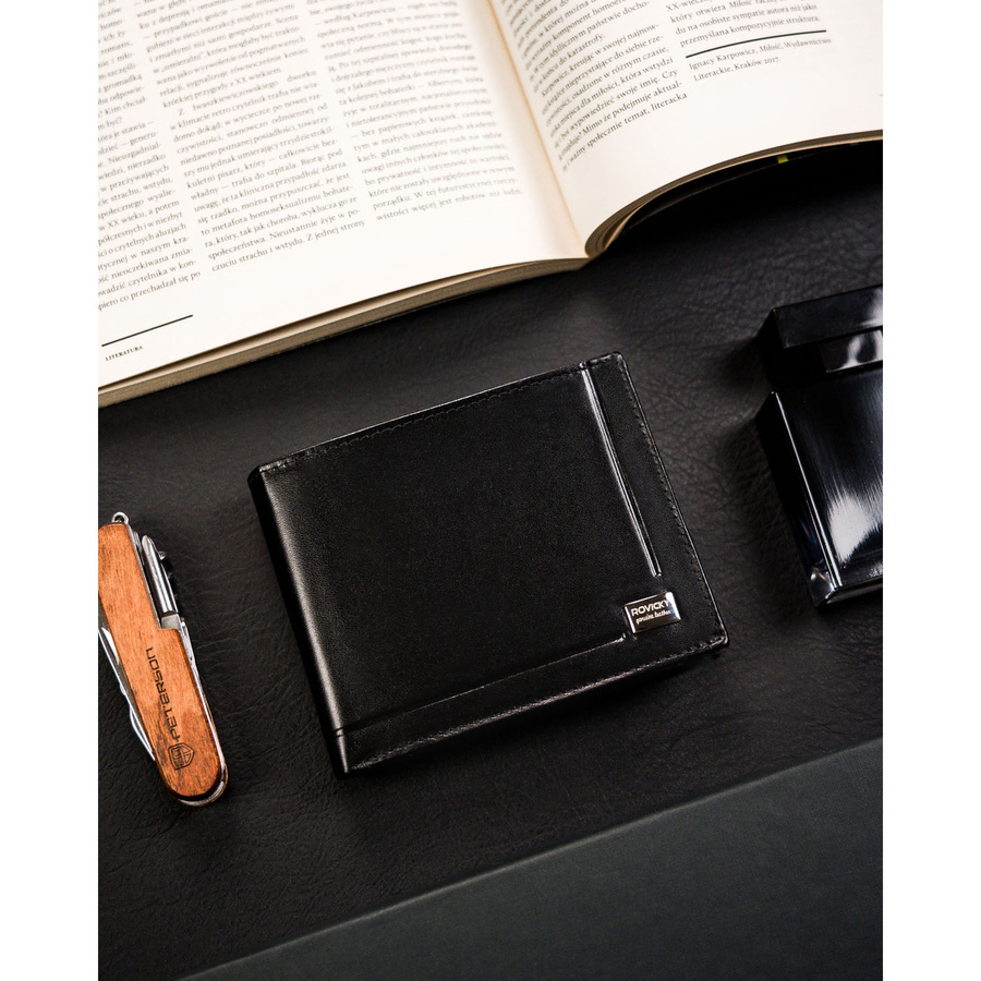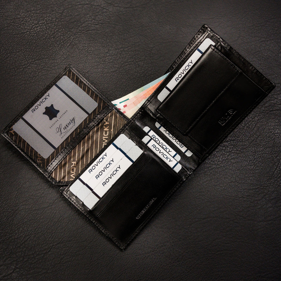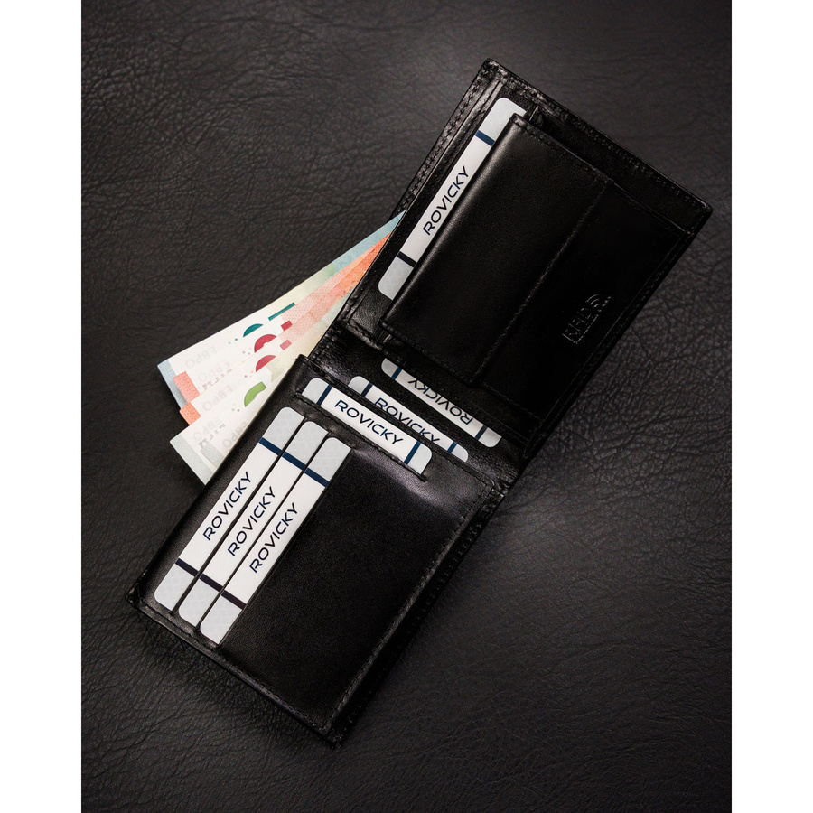 Portfel męski ze skóry naturalnej w czarnym kolorze bez zapięcia zewnętrznego – Rovicky
