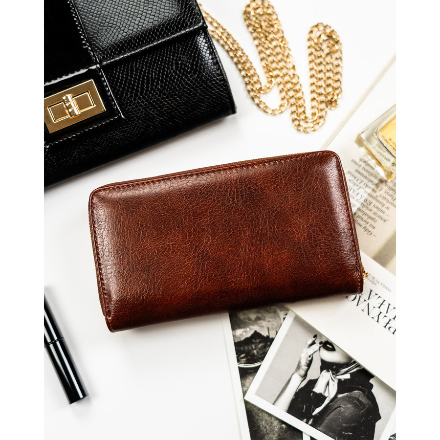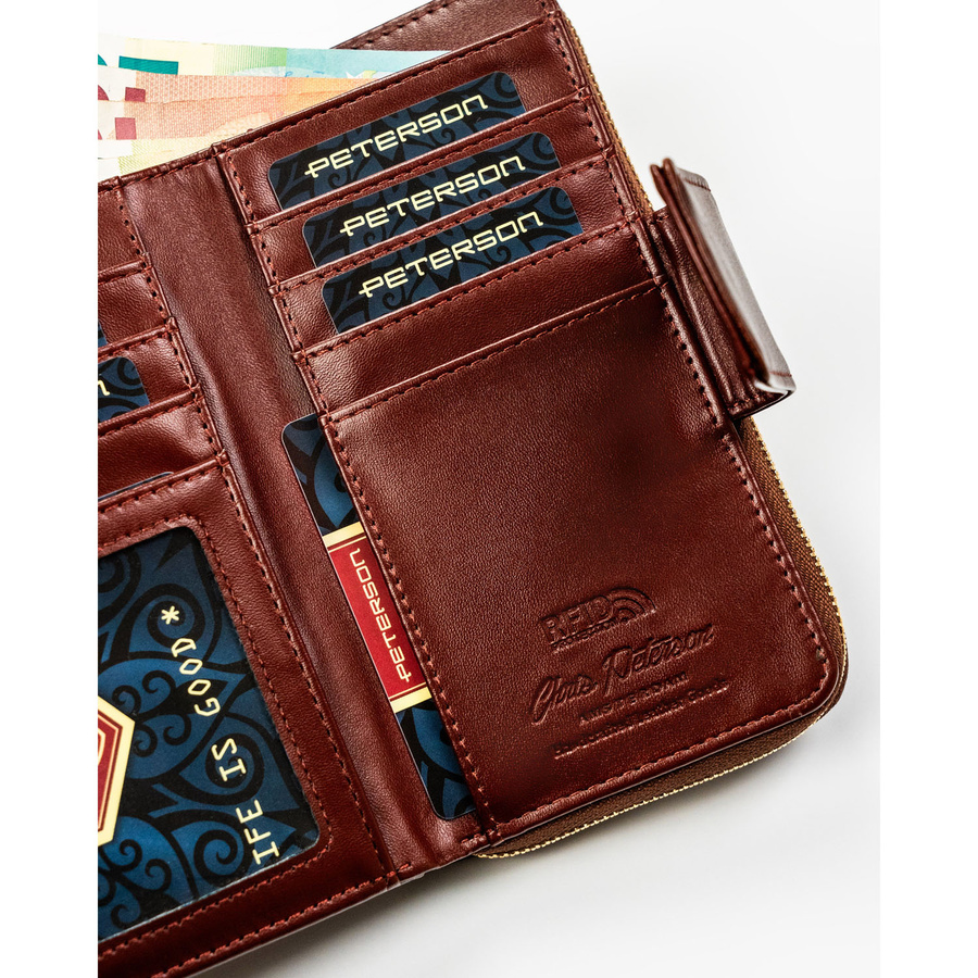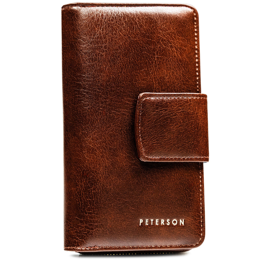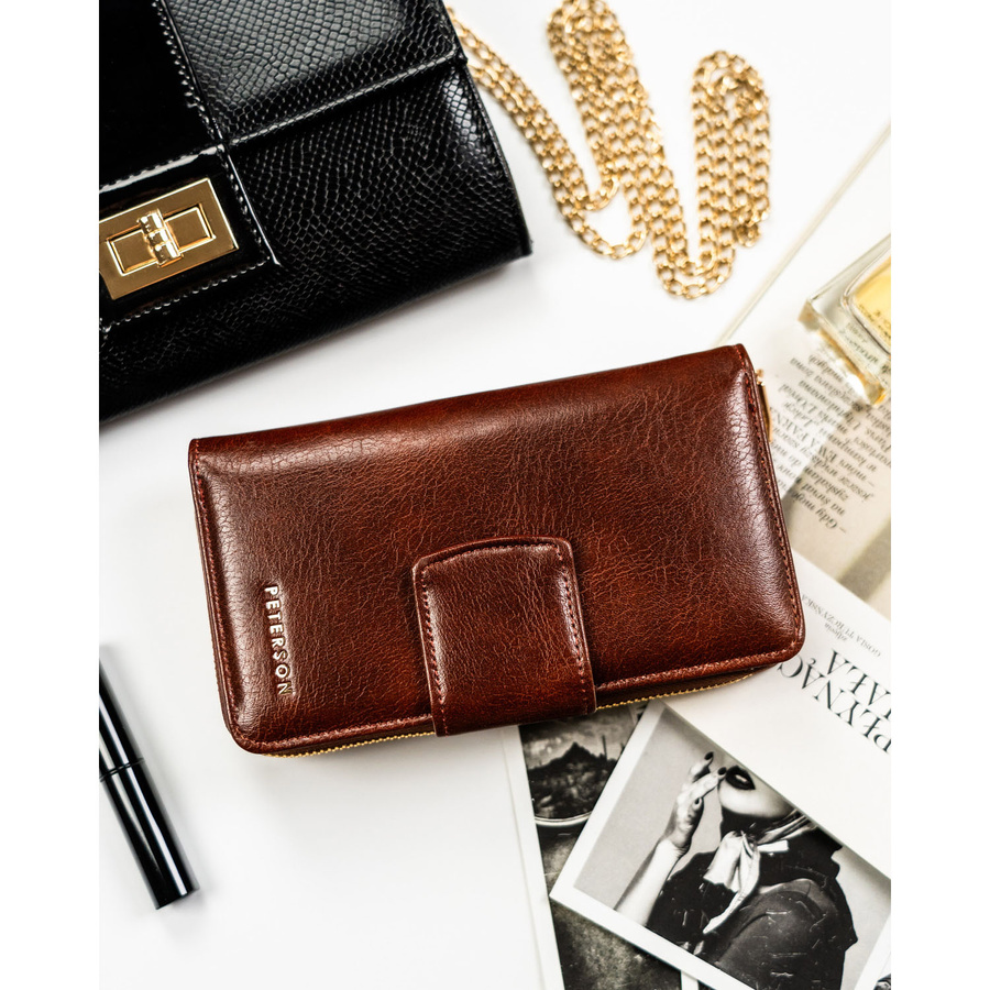 Portfel ze skóry ekologicznej w ciemnobrązowym kolorze, zamykany zatrzaskiem i suwakiem – Peterson