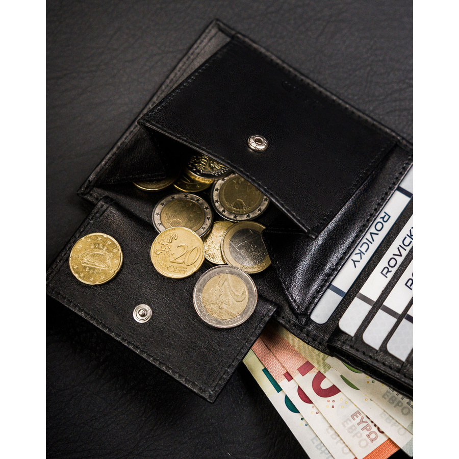 - 2 szerokie kieszenie umożliwiają oddzielenie różnych walut lub banknotów o różnych nominałach.