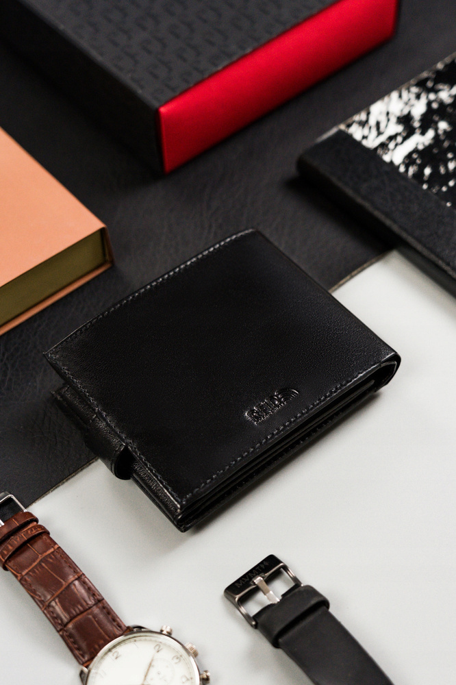 - Klasyczny styl | Męski design w czarnej kolorystyce. Elegancki portfel, który będzie świetnym dodatkiem zarówno na co dzień jak i na formalne okazje;