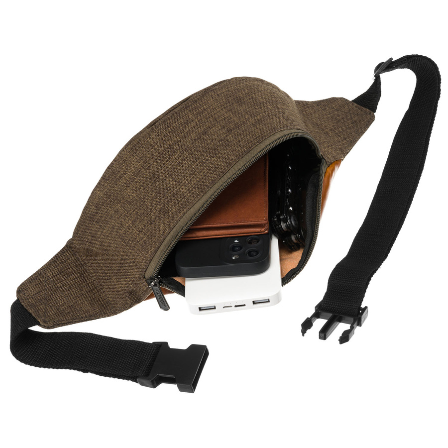 - Regulowany pasek, pozwalający dopasować saszetkę do sylwetki.