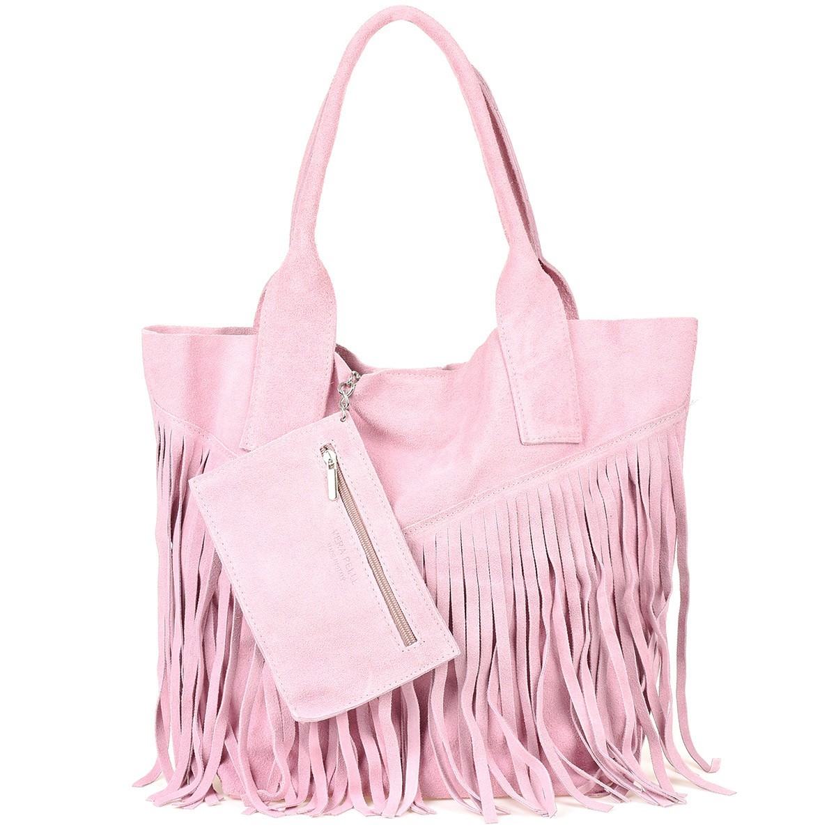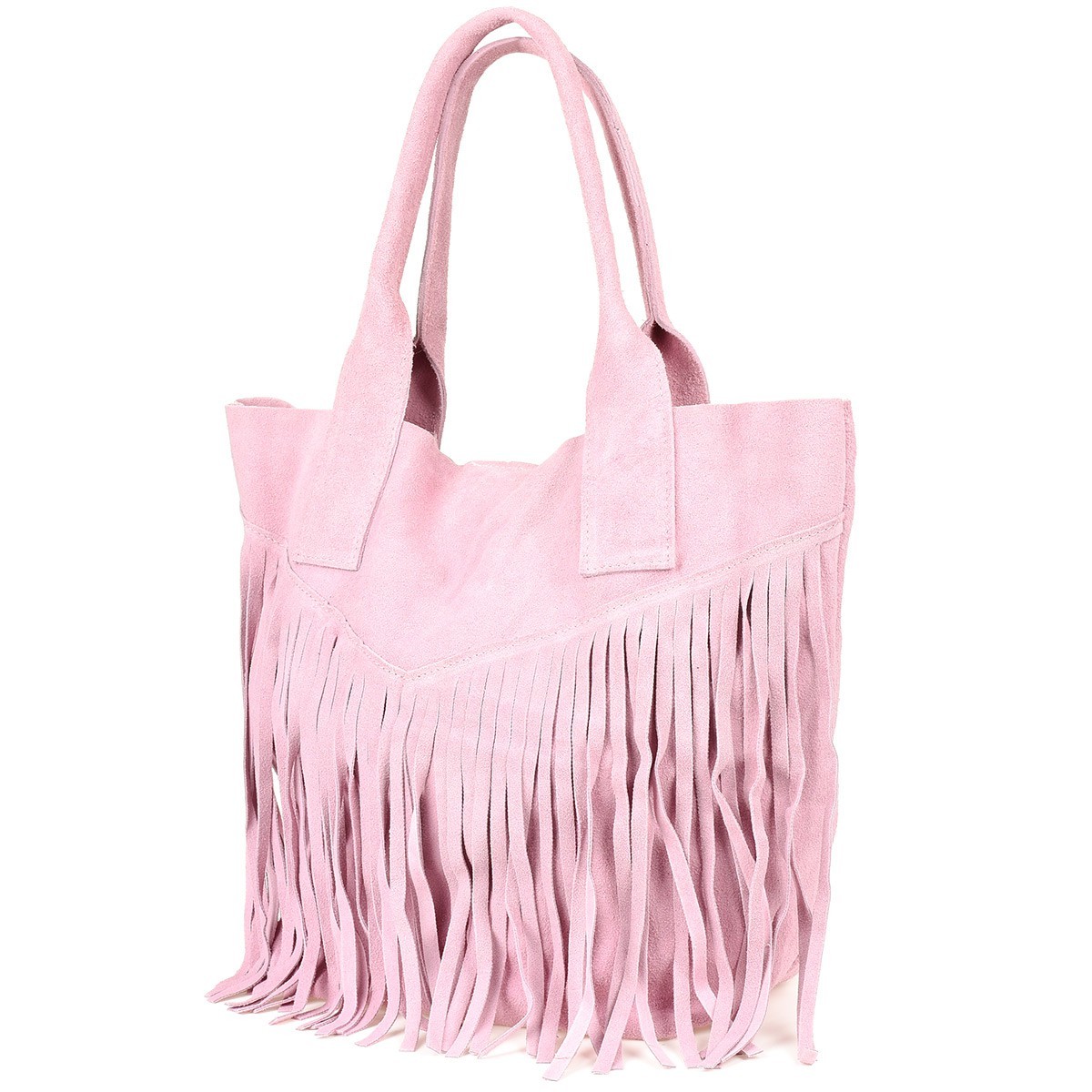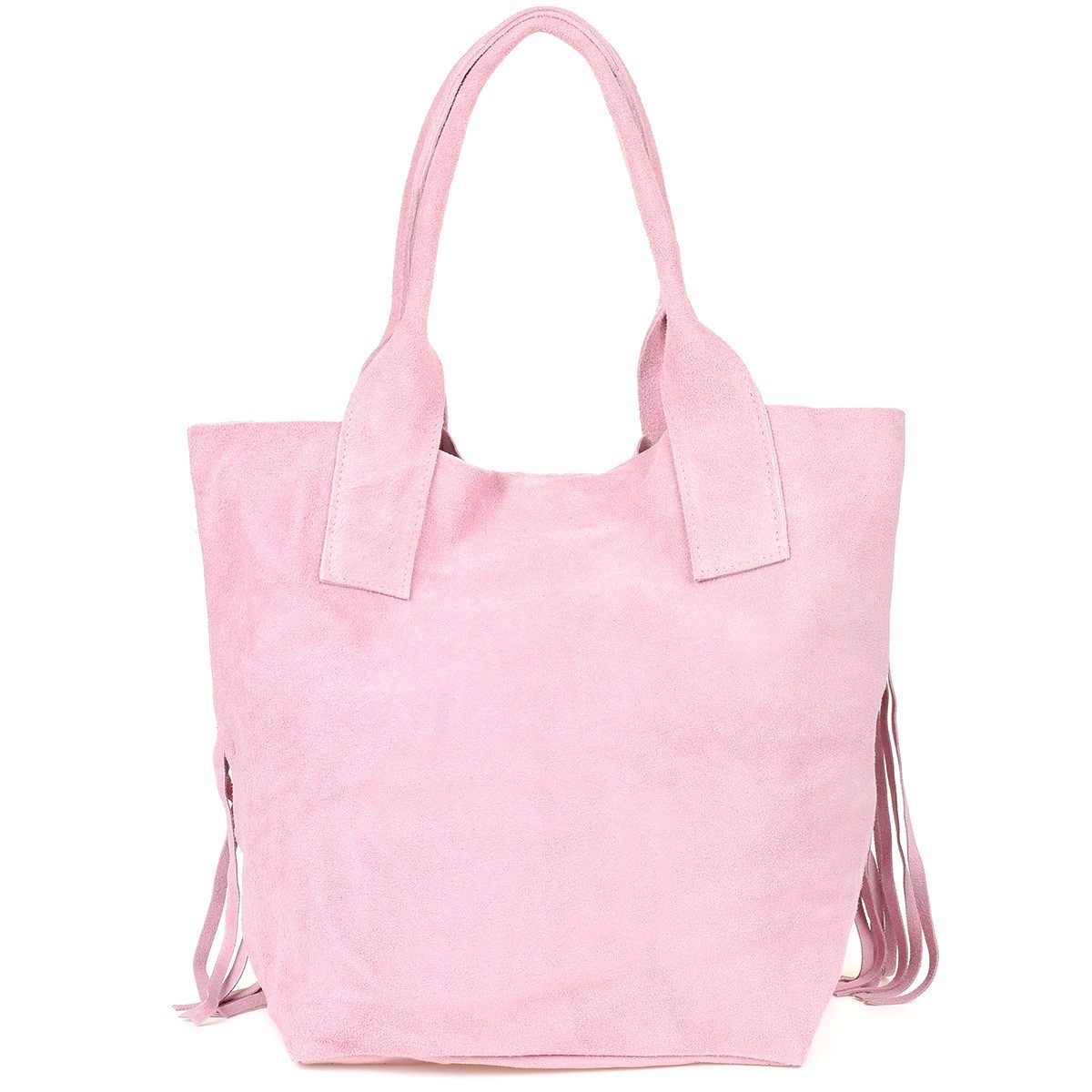 Pudrowo różowa Torebka damska skórzana zamszowa A4 frędzel duża L83