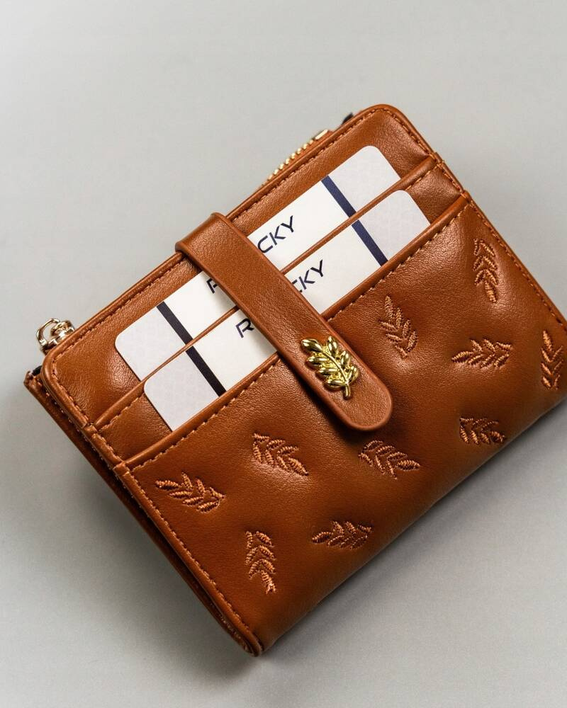 - Wyróżnij się | Na zewnątrz portfela znajdują się śliczne roślinne zdobienie i zatrzask w tym samym stylu.