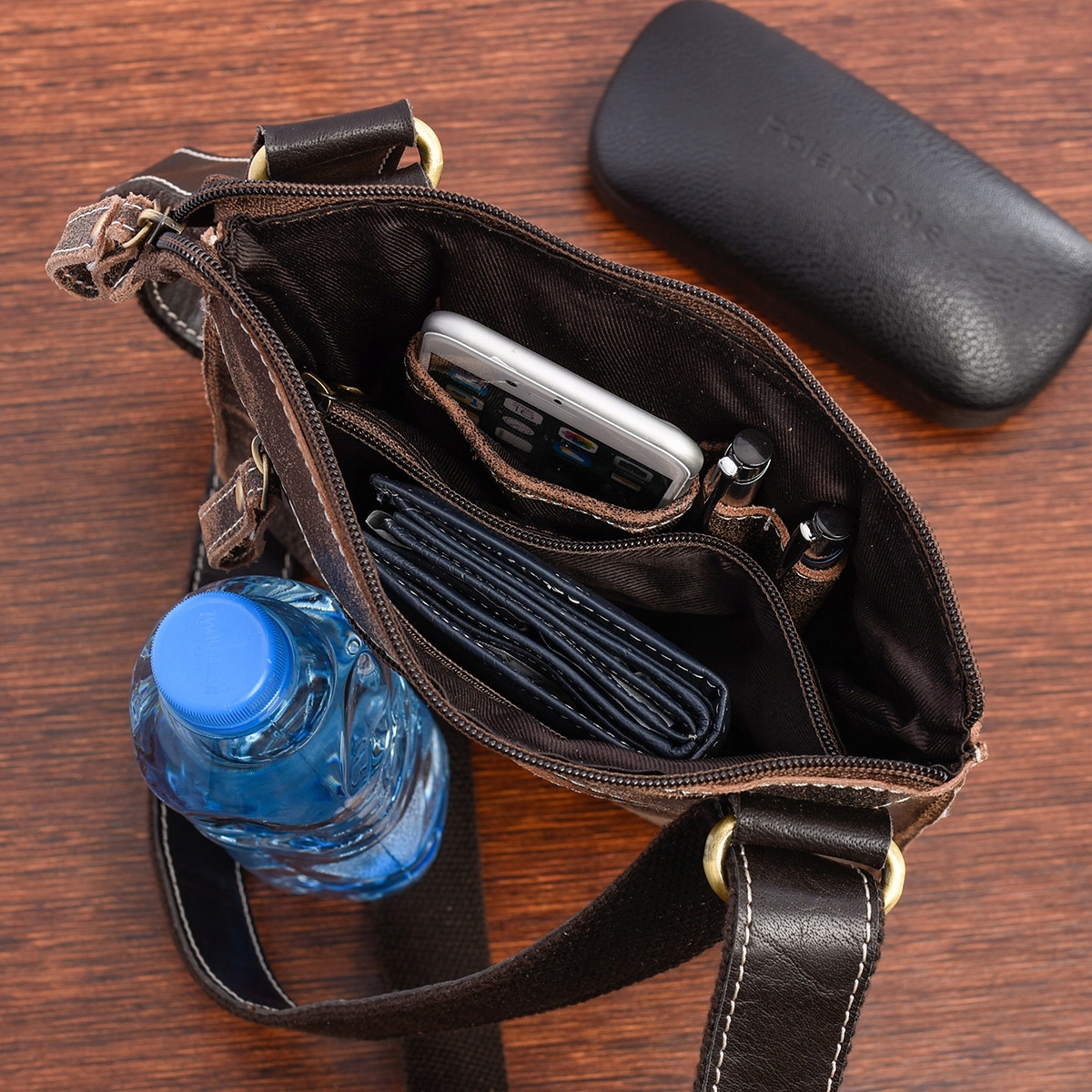 - Torba posiada mocny parciany pasek, obszyty skórą, mocowany na solidne klamry – regulowany w zakresie 90-180 cm.