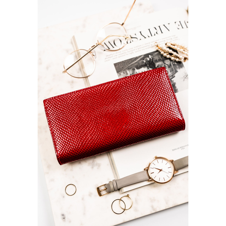 - Portfel ma elegancki, lakierowany wygląd z tłoczoną fakturą przypominającą skórę węża.