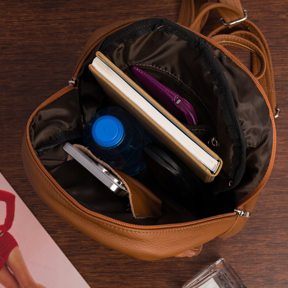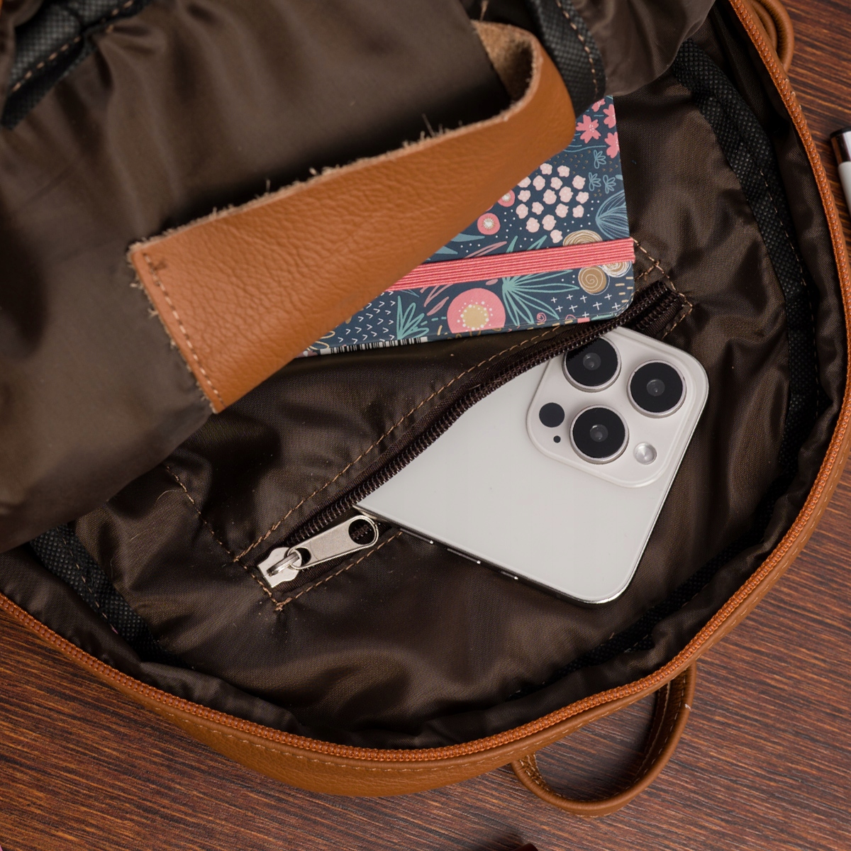 - Rączka: Skórzana rączka o długości ok. 25 cm pozwala na wygodne przenoszenie plecaka w dłoni, a także na zawieszenie go na wieszaku lub krześle.