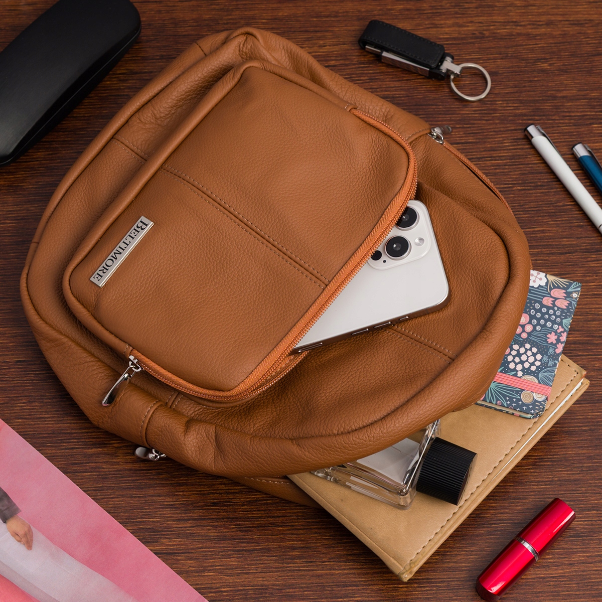 - Szelki: Plecak wyposażony jest w skórzane szelki z możliwością regulacji długości w zakresie od ok. 50 cm do ok. 100 cm, co zapewnia komfort noszenia.