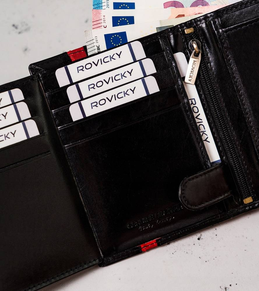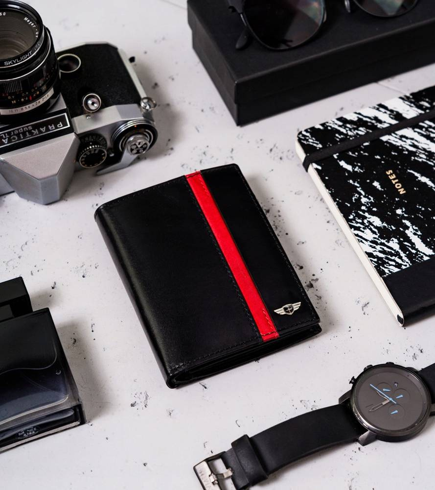 - Elegancki fason, który nigdy nie wyjdzie z mody | Czarny kolor to klasyka, a portfel w tym kolorze daje poczucie komfortu i świadomość, że możesz poczuć się modnie. Front portfela zdobi elegancki czerwony pasek
