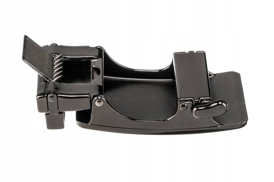 - Pasek z klamrą automatyczną | Zakończony czarną, logowaną klamrą z subtelnym zdobieniem. Ten rodzaj klamry umożliwia bardzo sprawne zapięcie i rozpięcie paska;