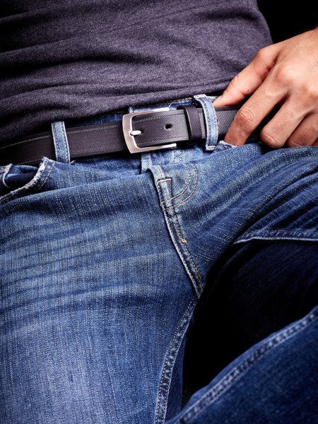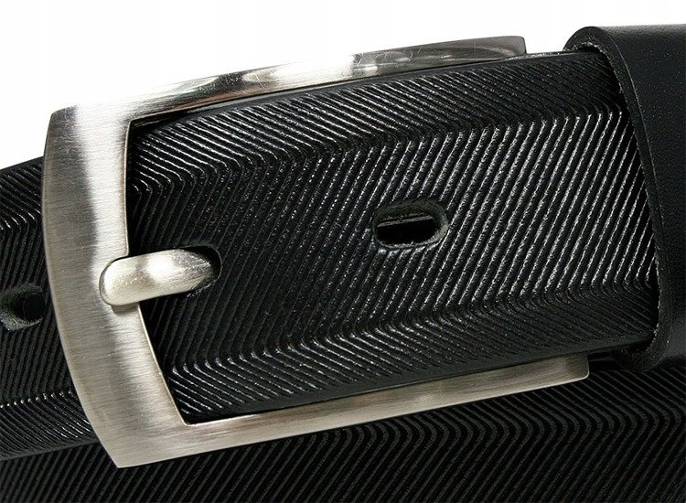 Stylowy pasek męski z wysokogatunkowej skóry naturalnej w uniwersalnej kolorystyce. Środek wykończony stylowymi, prążkowanymi zdobieniami. Zapinany za pomocą metalowej, srebrnej klamry wykonanej z niklu. Przy sprzączce szlufka przytrzymująca końcówkę paska. Wyposażony w siedem otworów regulujących obwód, umiejscowionych względem siebie w odstępie ok. 2 cm. Średnia szerokość, wynosząca 3,4 cm. Model wizualnie cienki, świetnie zaprezentuje się w codziennym ubiorze jak i przy oficjalnych stylizacjach.