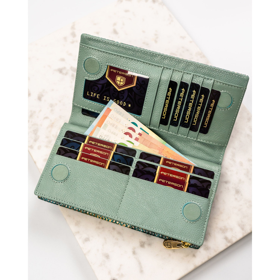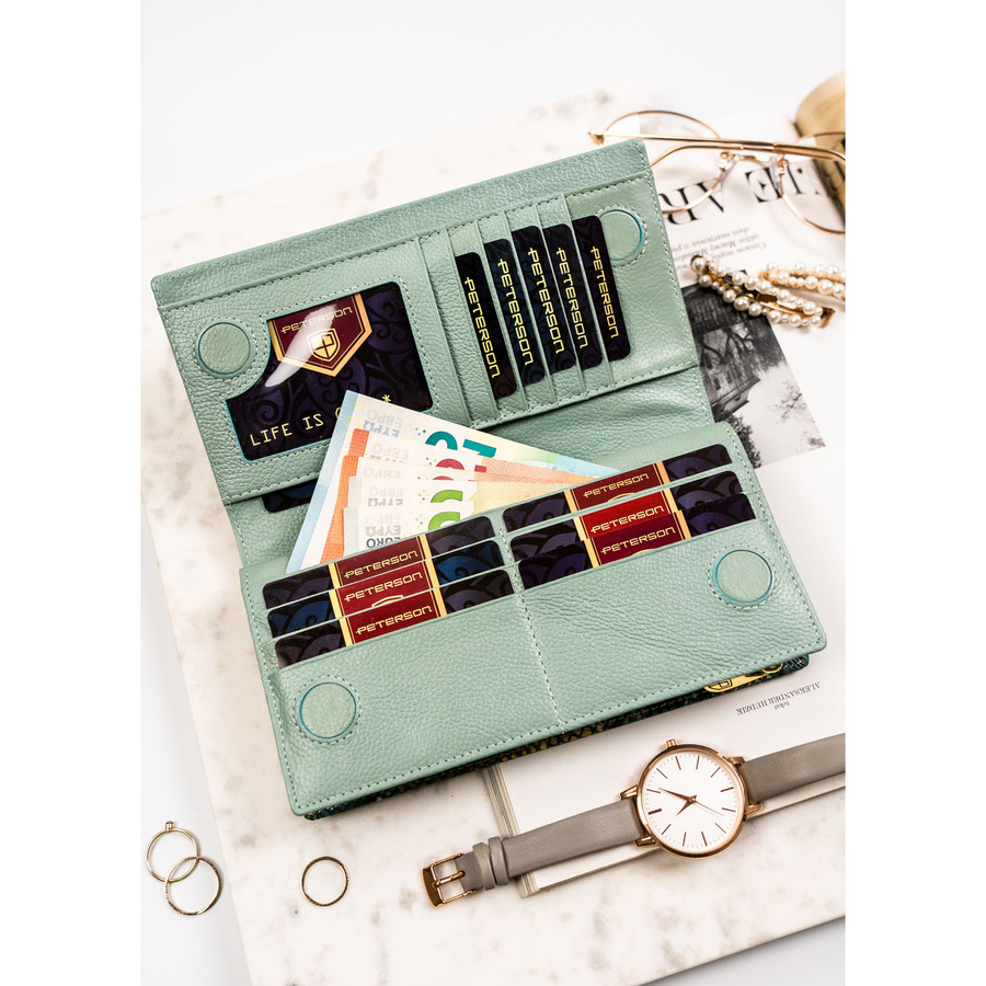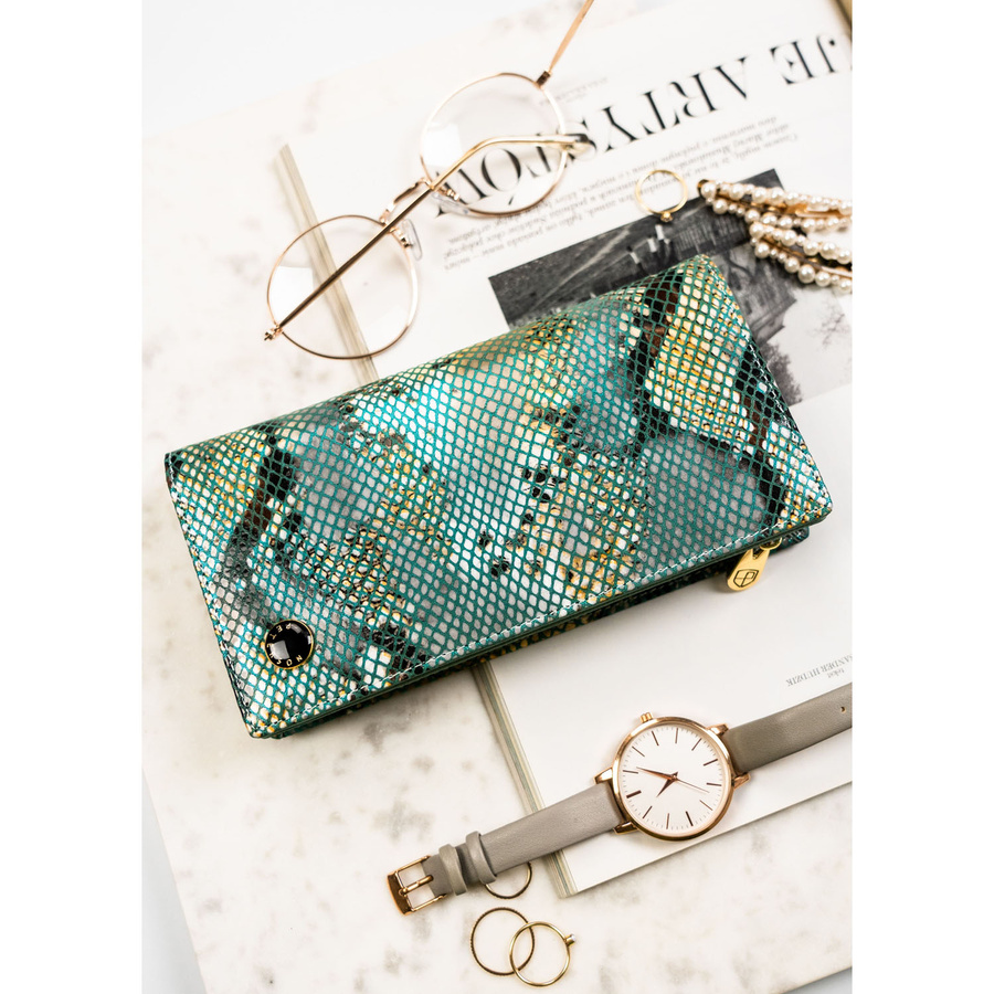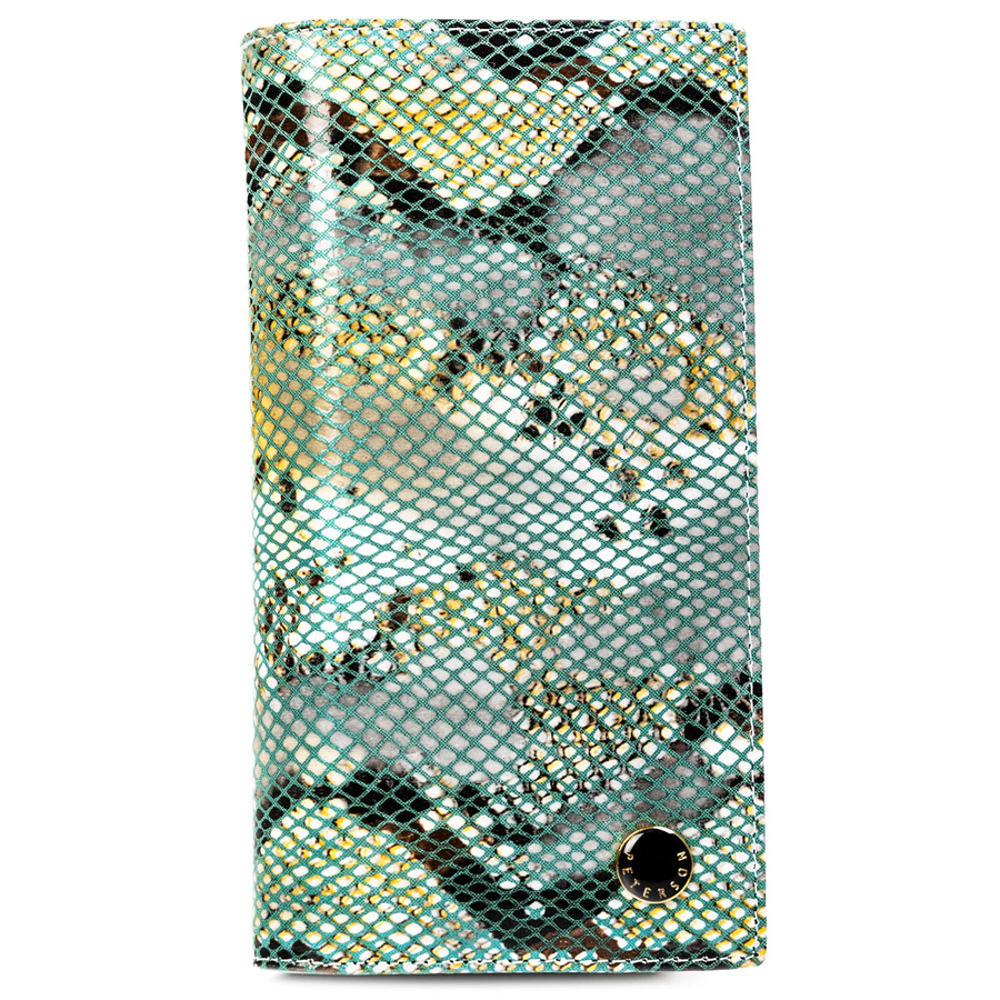 Skórzany, pionowy portfel damski na magnes z fakturą imitującą skórę węża – Peterson