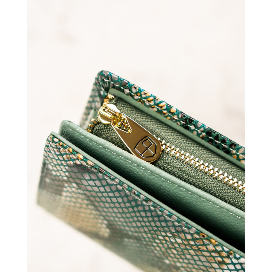 - Portfel ma elegancki, lakierowany wygląd z tłoczoną fakturą przypominającą skórę węża.