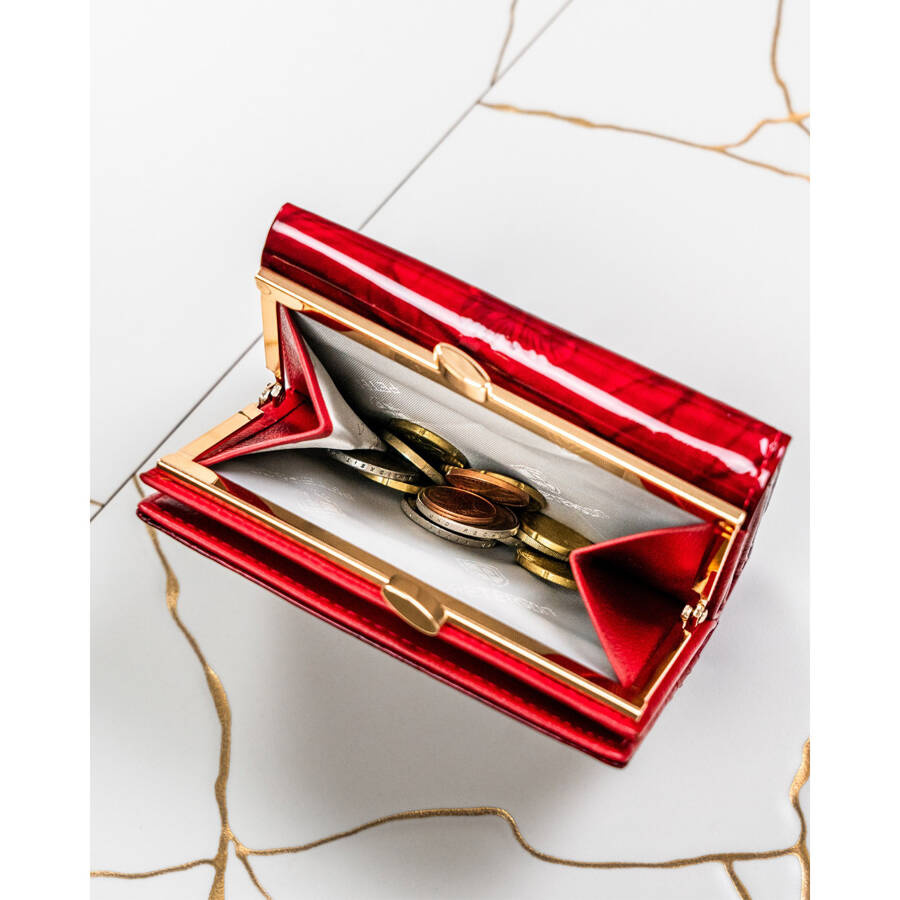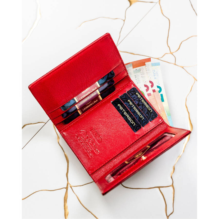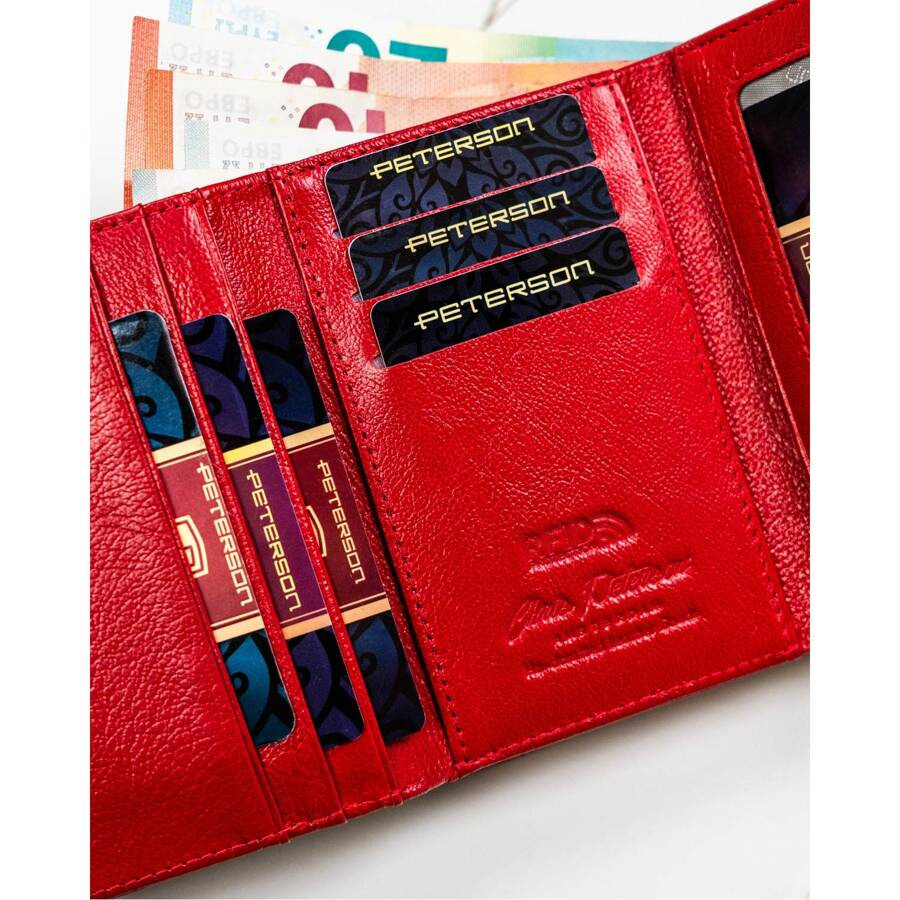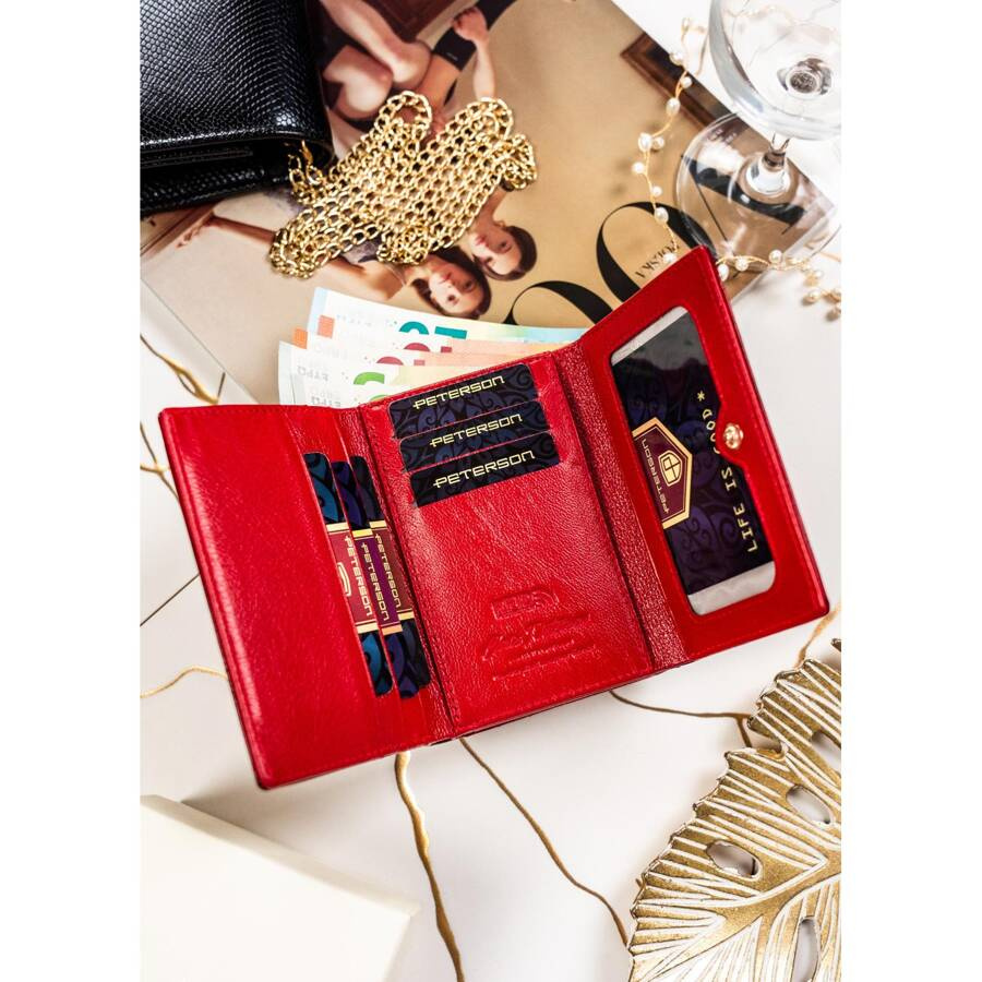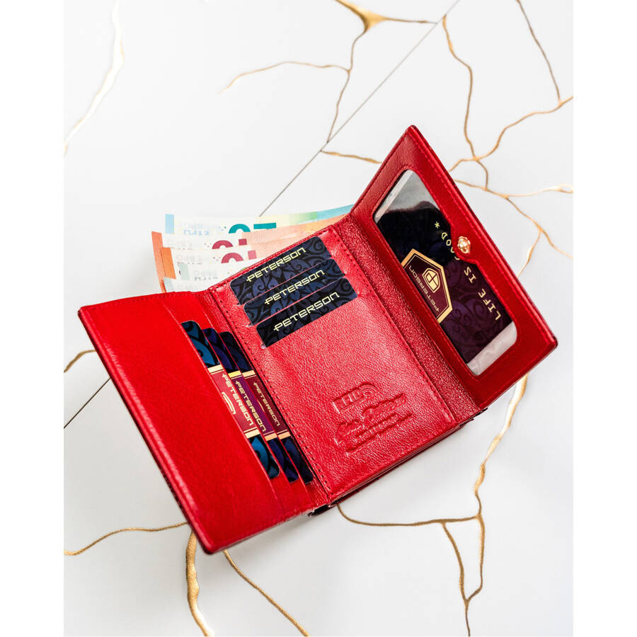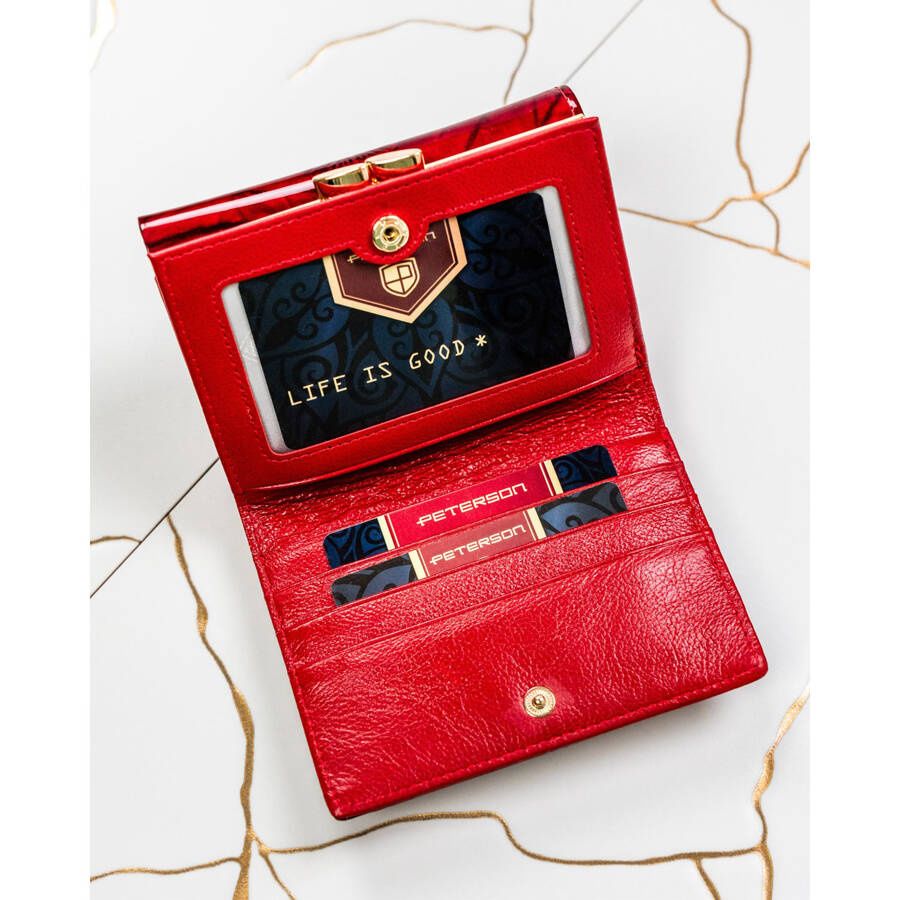 Skórzany portfel damski czerwony z kieszenią na bilon zamykaną biglem – Peterson