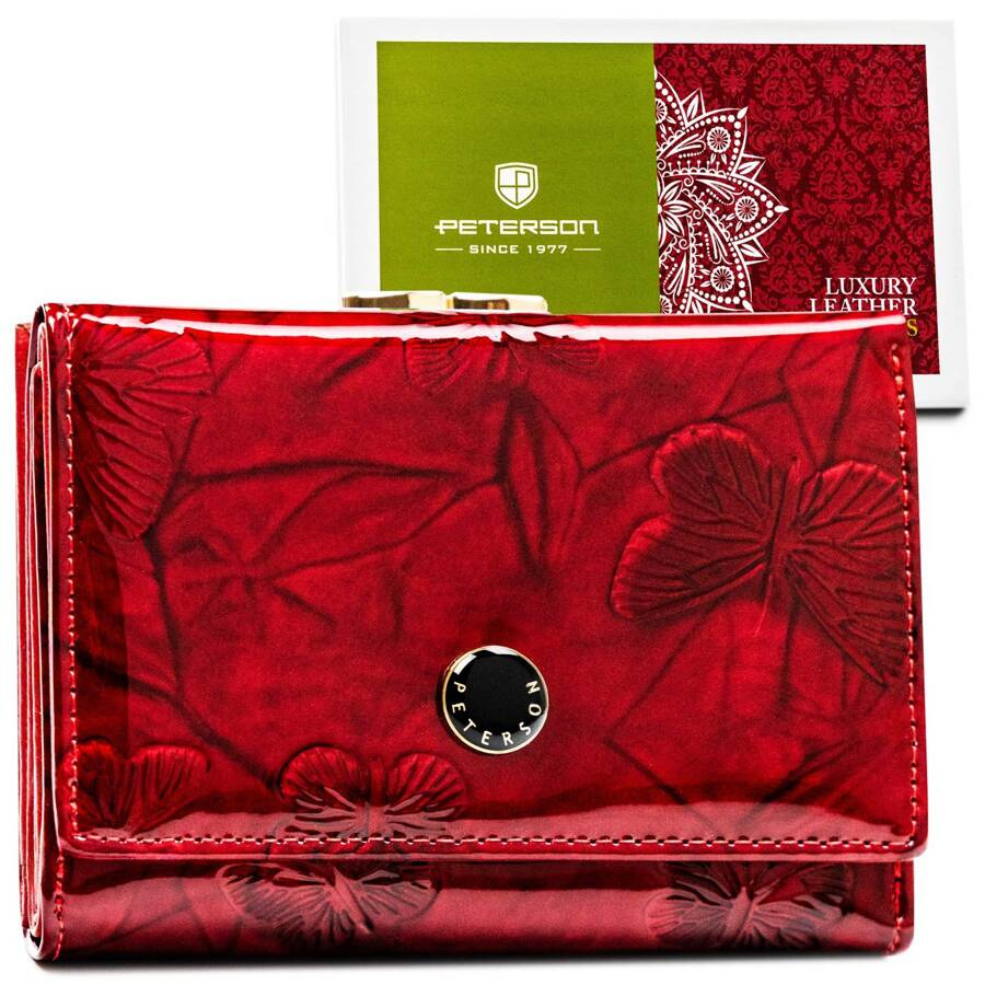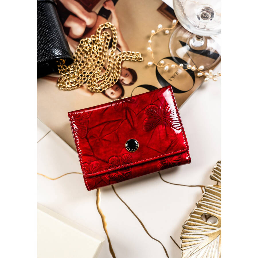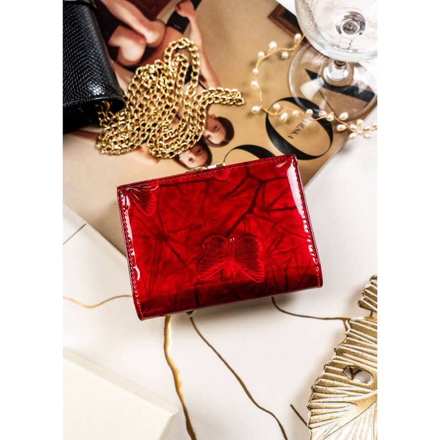 - Zewnętrzna strona portfela, wykonana z lakierowanej skóry naturalnej, ozdobiona jest delikatnymi, tłoczonymi motywami motyli.