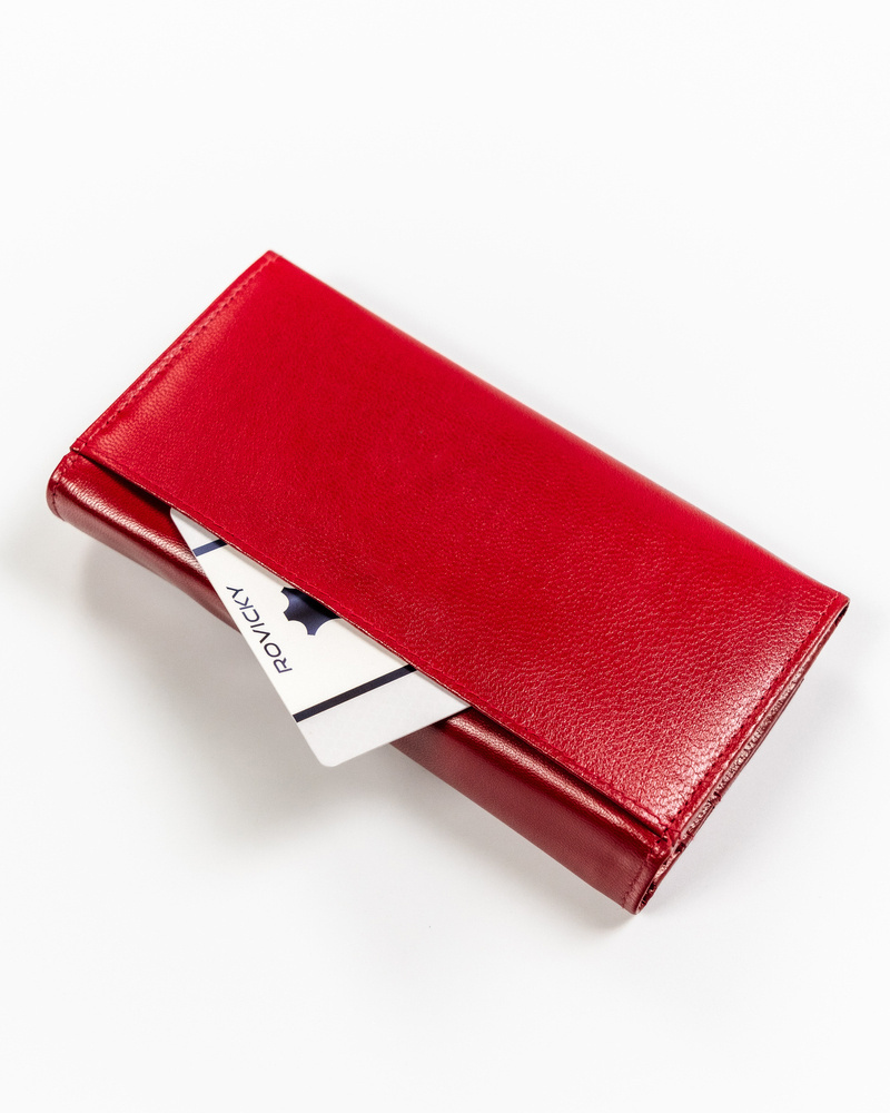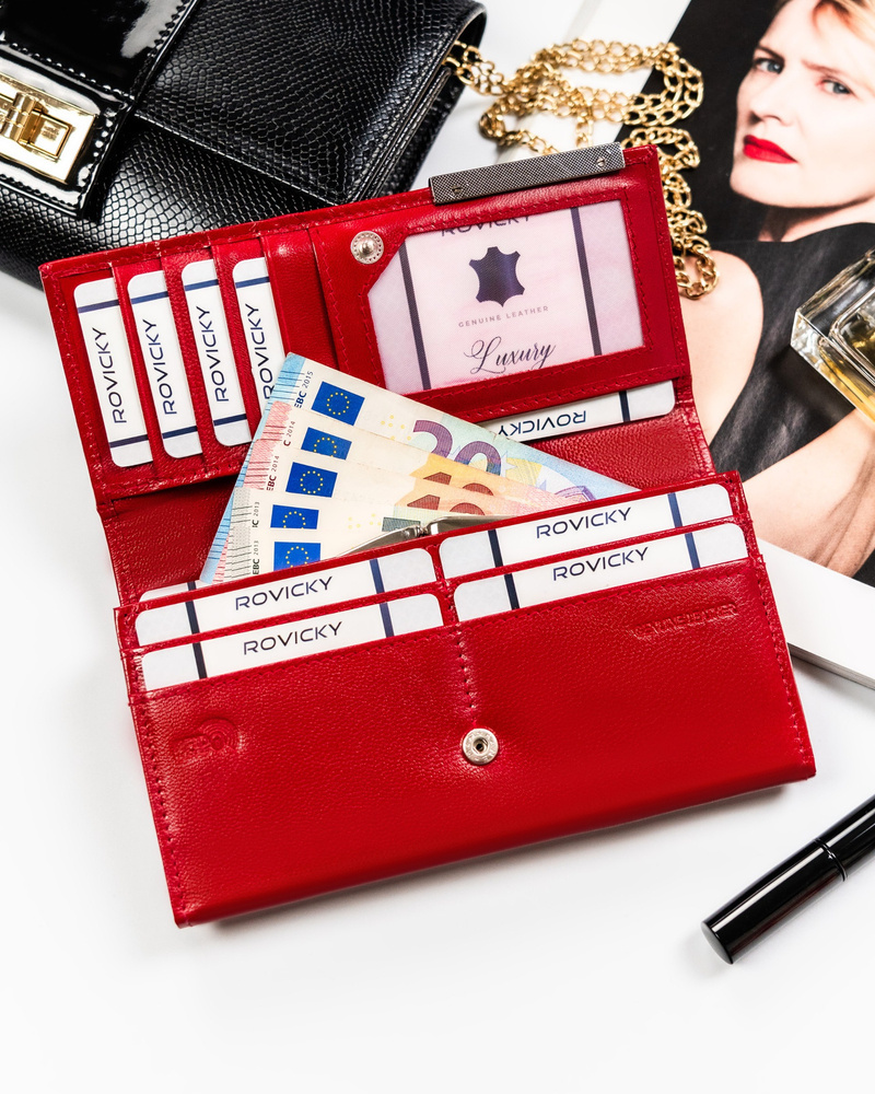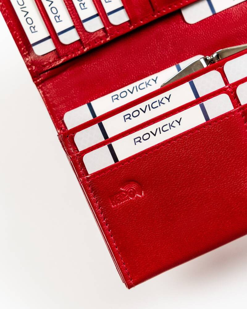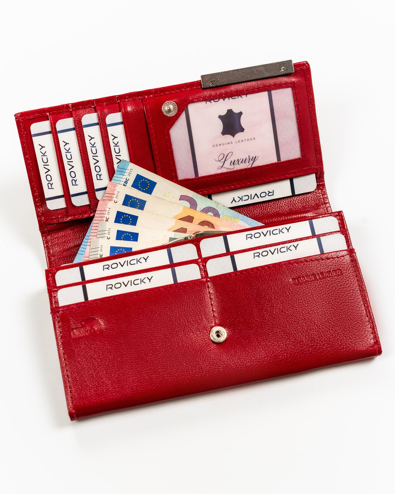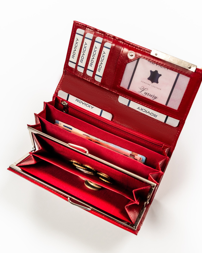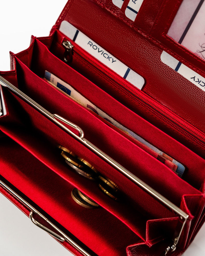 • 2 kieszonki na dokumenty w większym formacie, jak dowód rejestracyjny w okładce. Jedna z tych kieszonek mieści się po zewnętrznej części, z tyłu portfela i jest otwarta. Zalecamy jednak, by ważne dokumenty przechowywać  wewnątrz, zamykanego napą portfela.