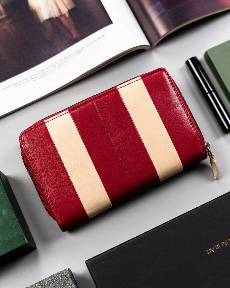 - Oryginalny design | Portfel o ponadczasowej stylistyce w ciekawym kolorze. Model w orientacji poziomej zapinany na trwały i solidny zatrzask. Faktura została ozdobiona pionowymi pasami;