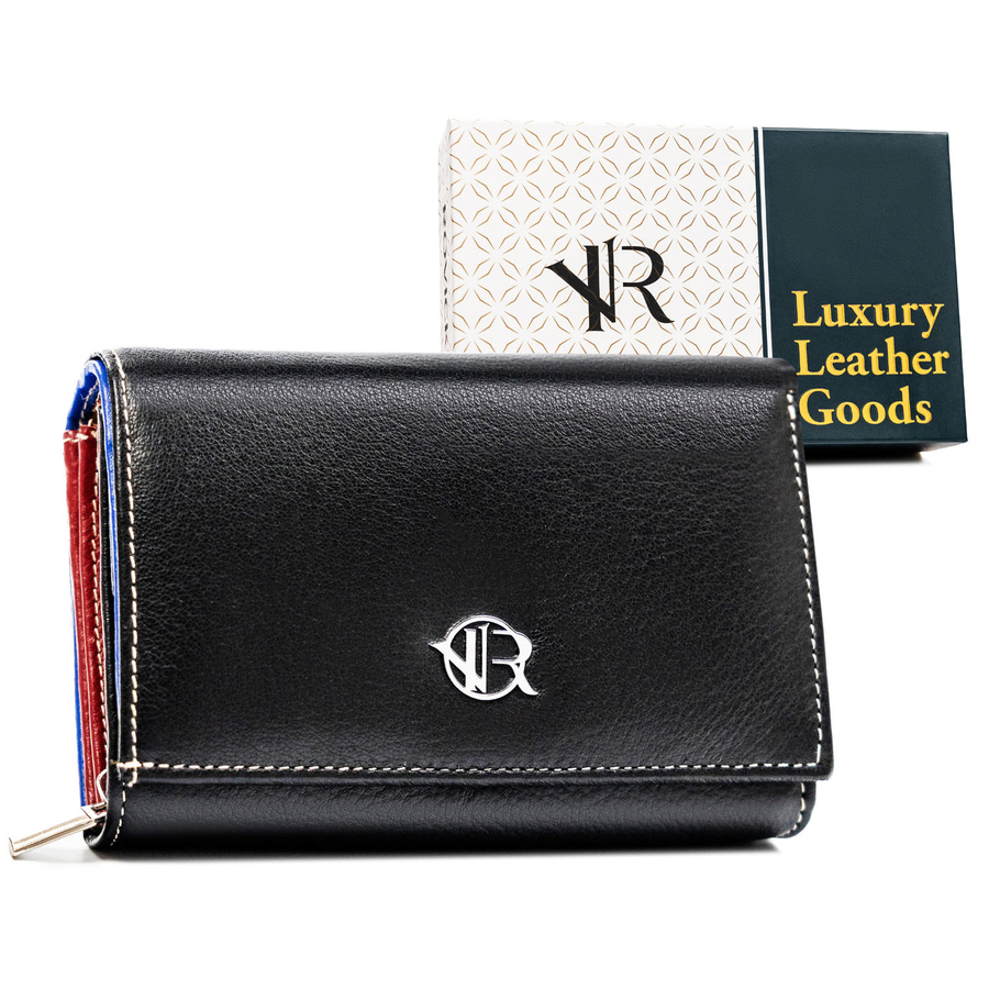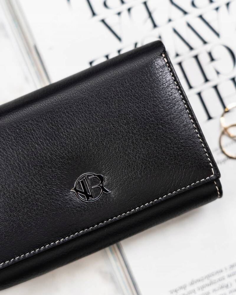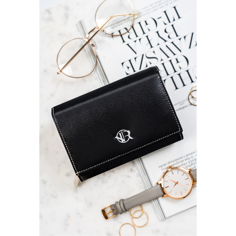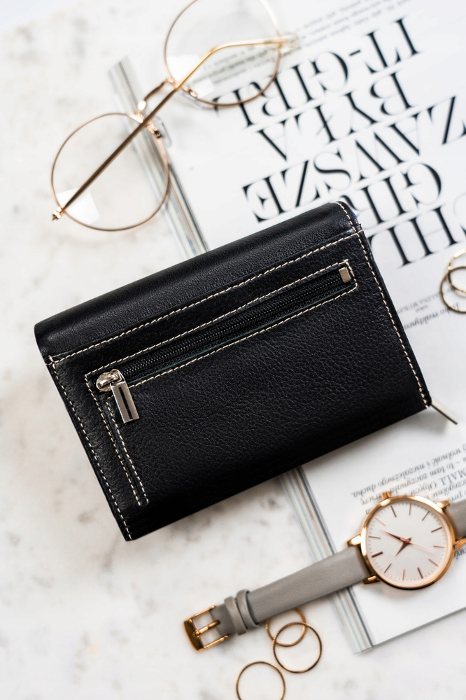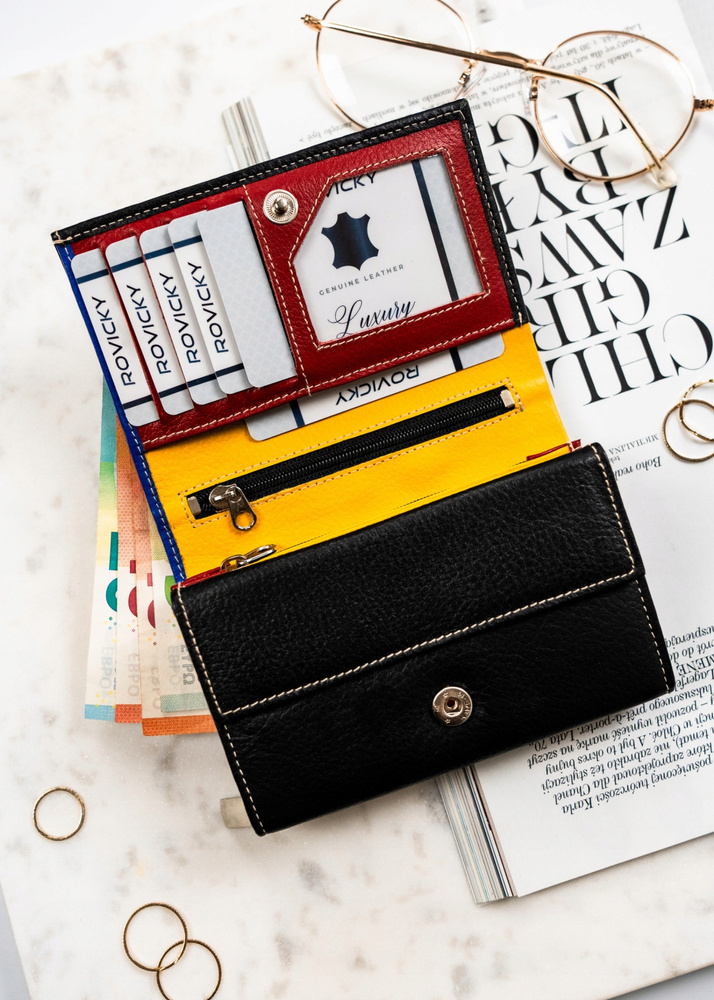 - Klapka z zamknięciem na zatrzask, zabezpiecza zawartość portfela przed niechcianym wysunięciem.