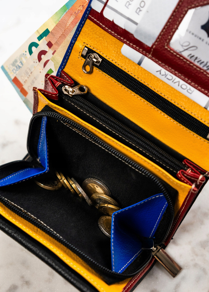 - 10 obszernych przegródek na dokumenty o większym formacie. Dwie z tych kieszonek mieszczą się na zewnętrznej części portfela i jedna z nich jest zasuwana na zamek błyskawiczny. Trzy kieszonki wewnętrzne są zamykane na suwak.