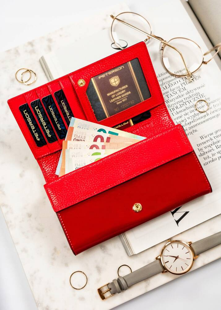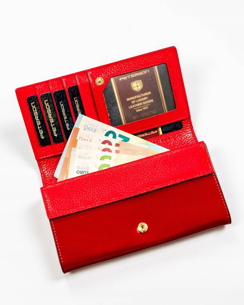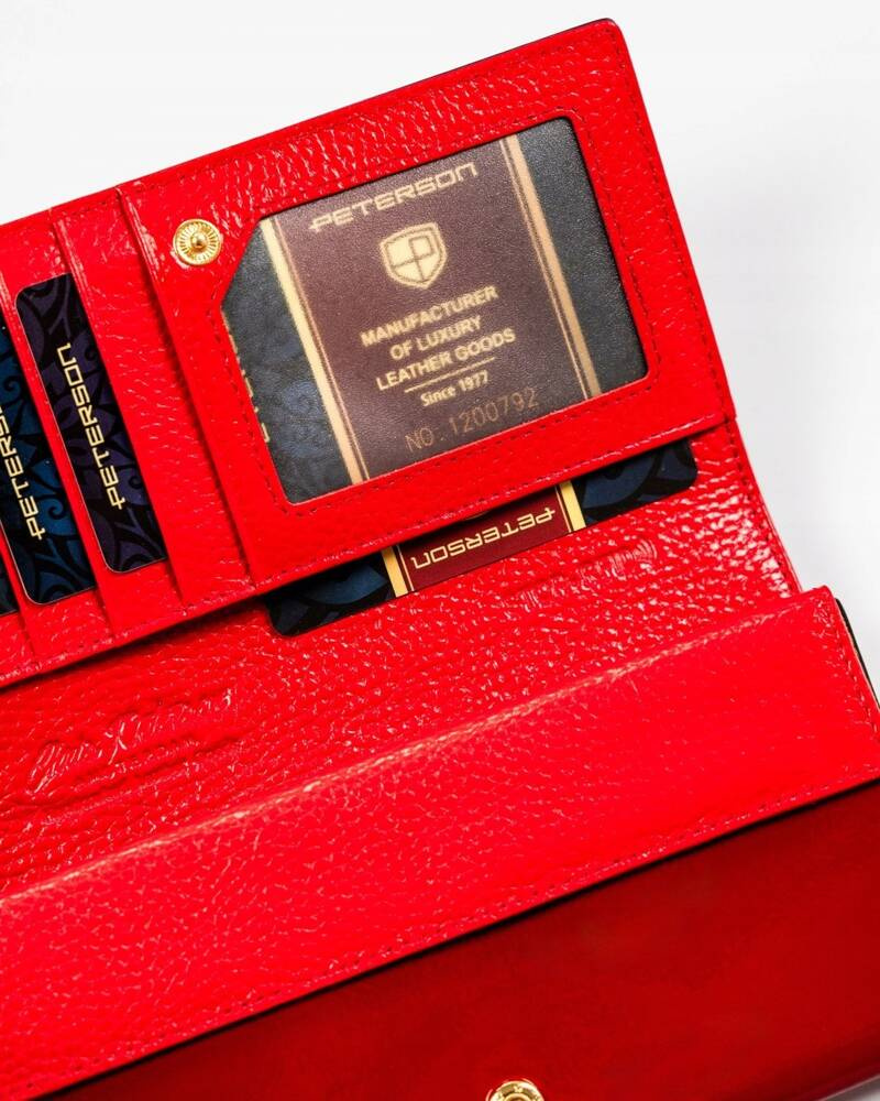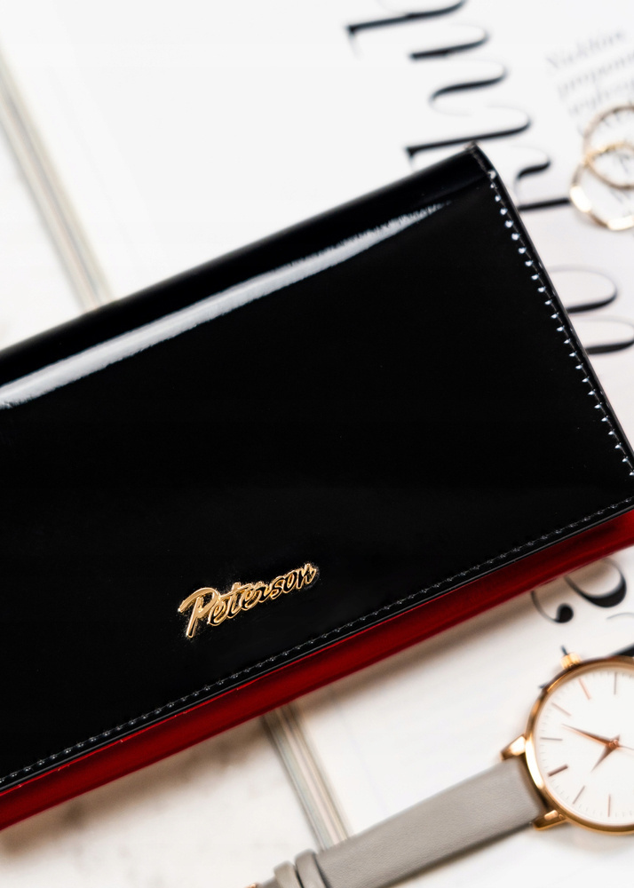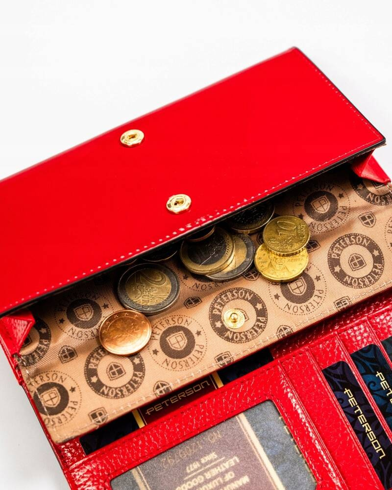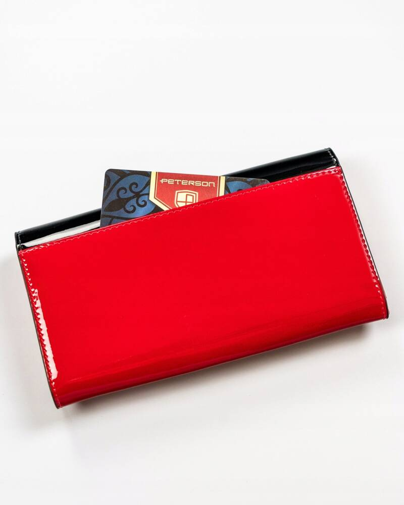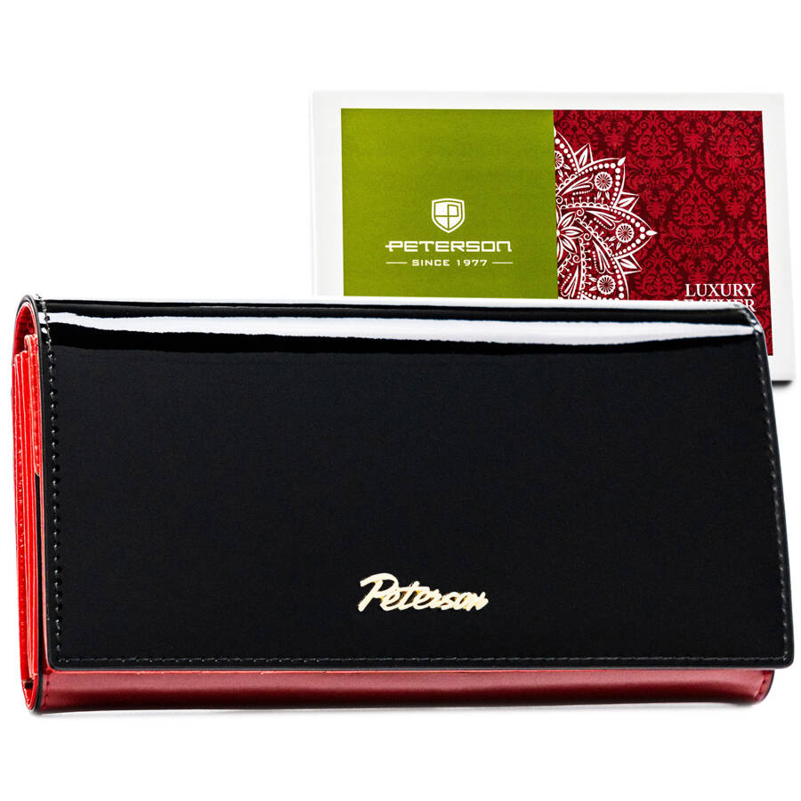 Skórzany portfel damski w kolorze czarno-czerwonym z zewnętrzną kieszenią – Peterson