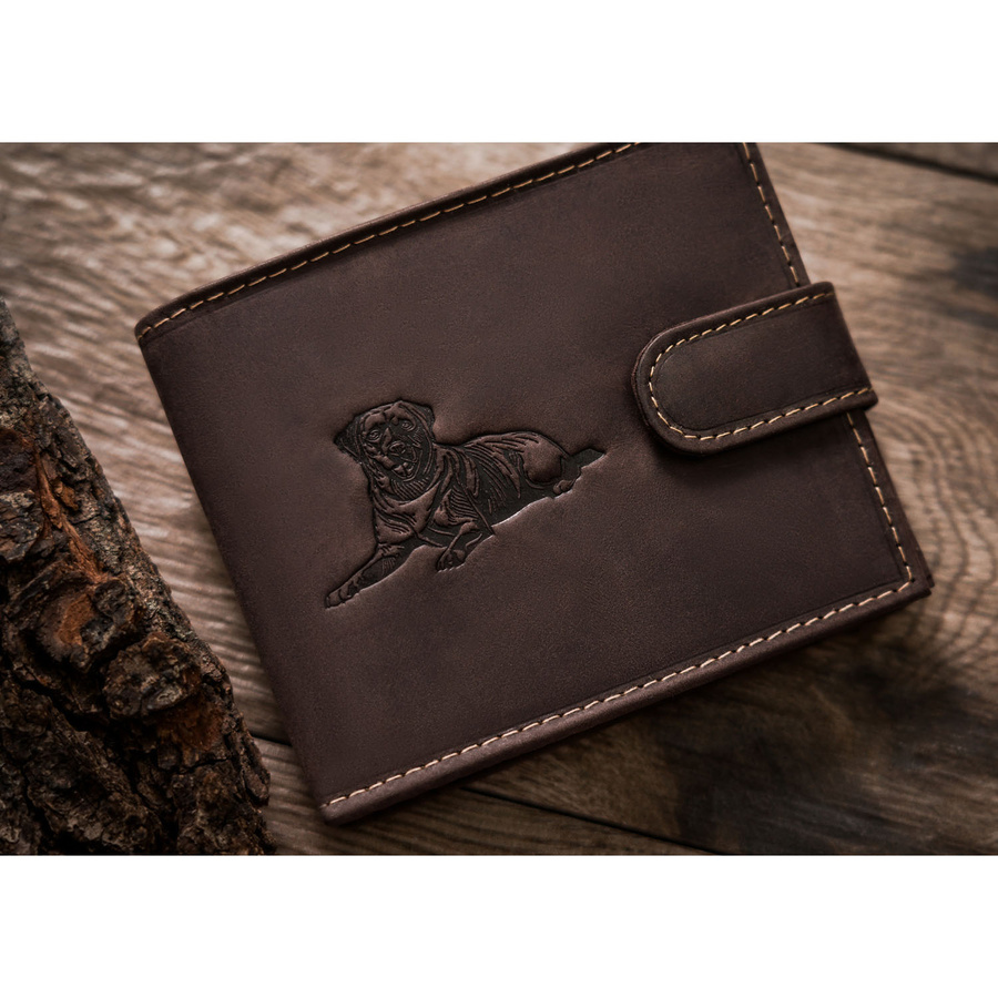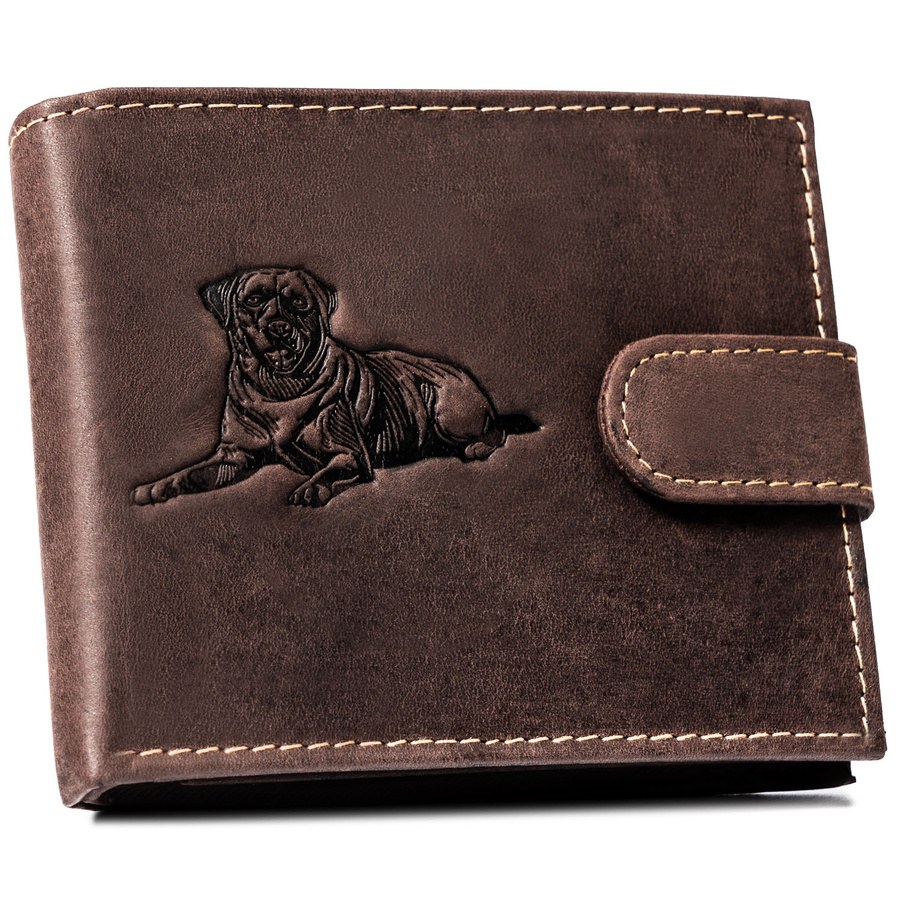 Skórzany portfel męski w ciemnobrązowym kolorze z tłoczeniem na froncie przedstawiającym psa