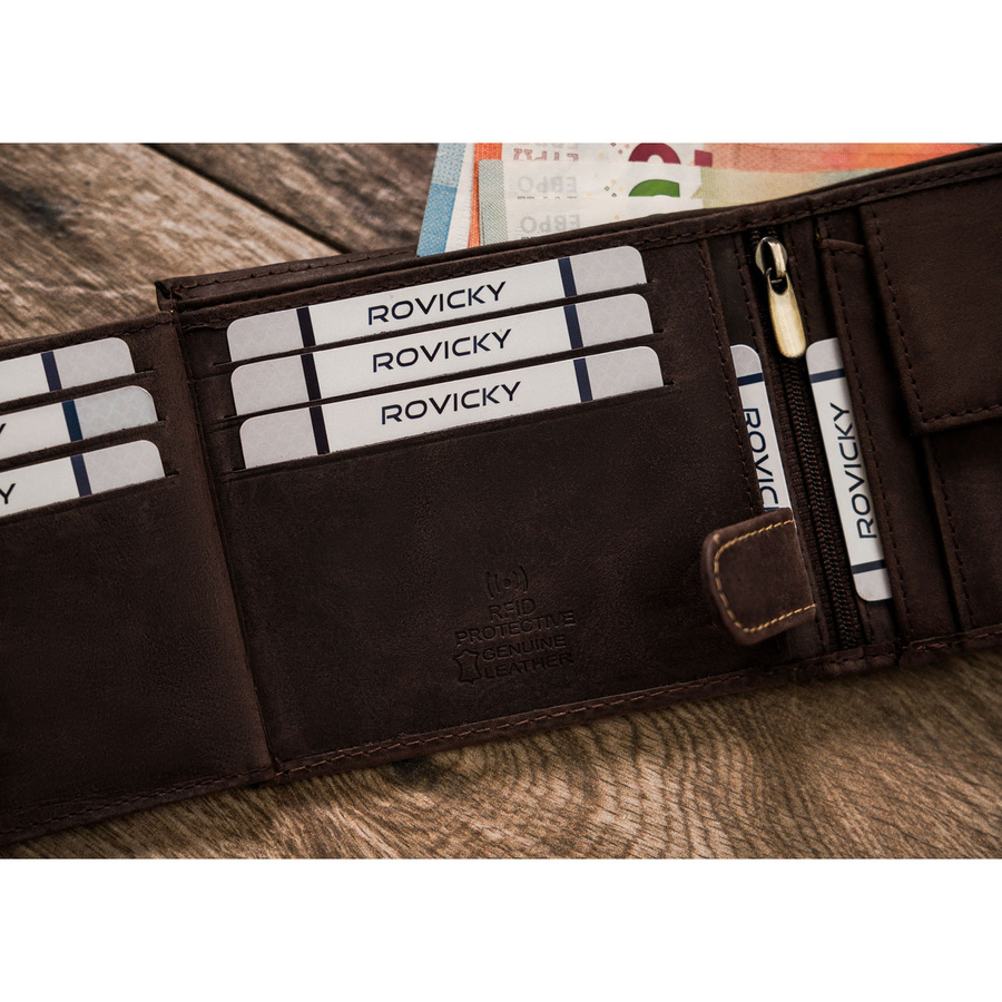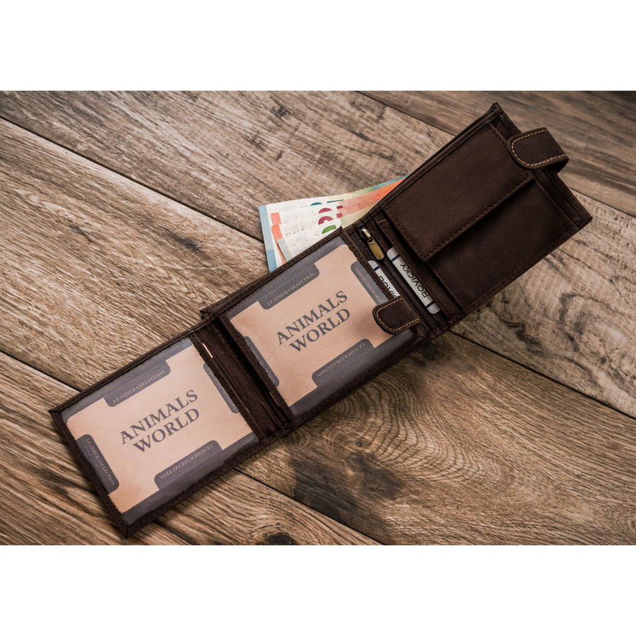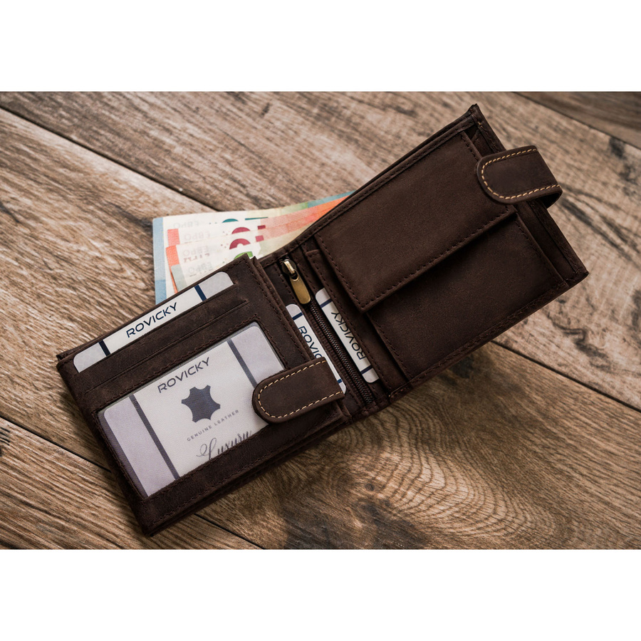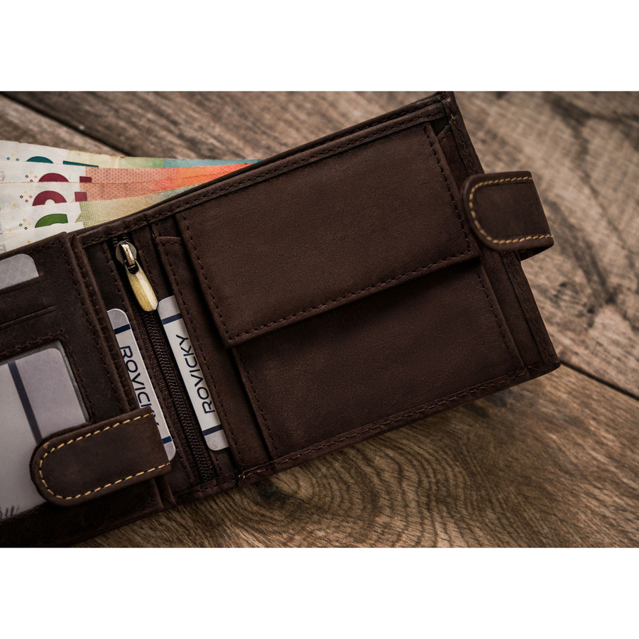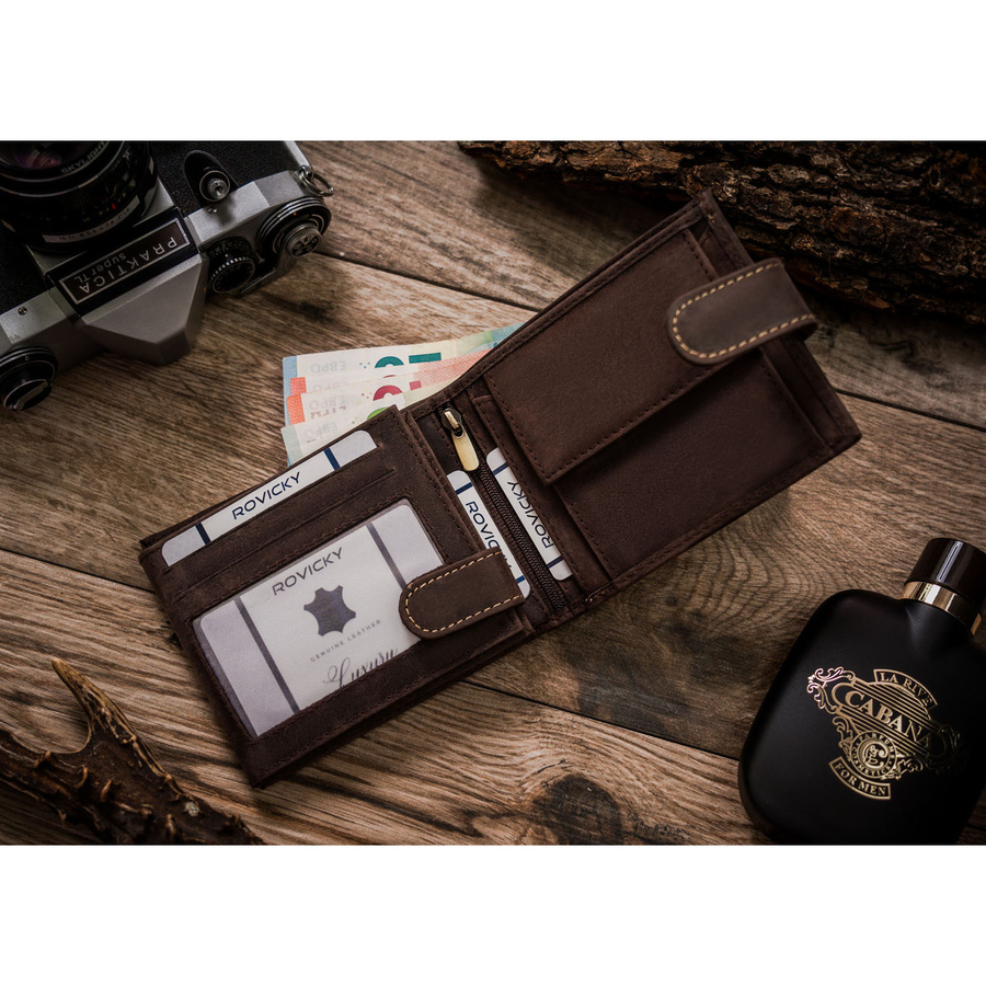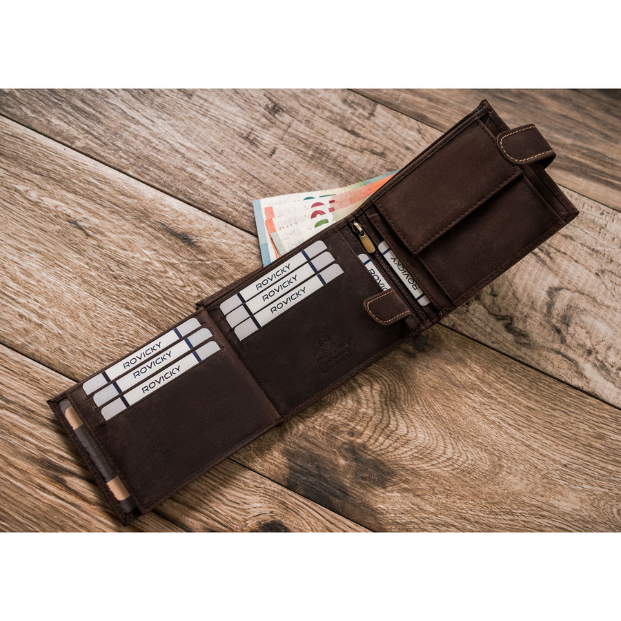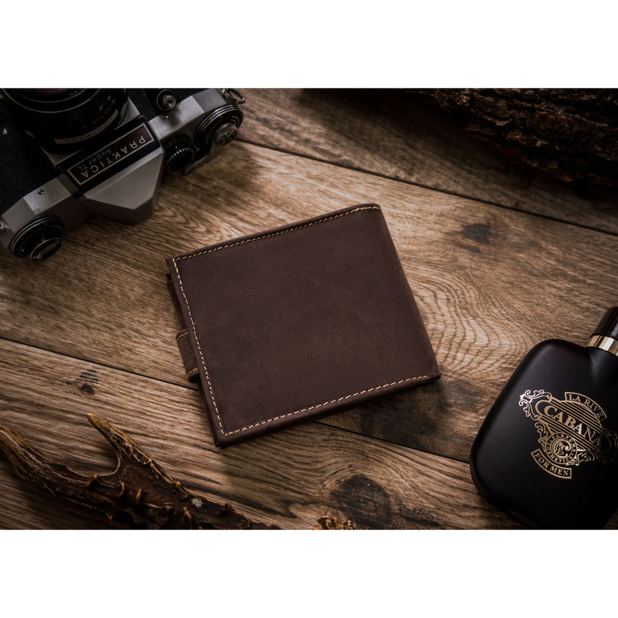 Portfel odszyty z trwałej nubukowej skóry naturalnej. Model o klasycznej stylistyce. Portfel w orientacji poziomej, zapinany na zatrzask. Posiada rozbudowane wnętrze – będzie idealnym wyborem właśnie dla Ciebie, jeżeli na co dzień nosisz dokumenty w dużym formacie jak np. dowód rejestracyjny. Ponadto zmieścisz w nim pokaźne ilości kart oraz gotówki.