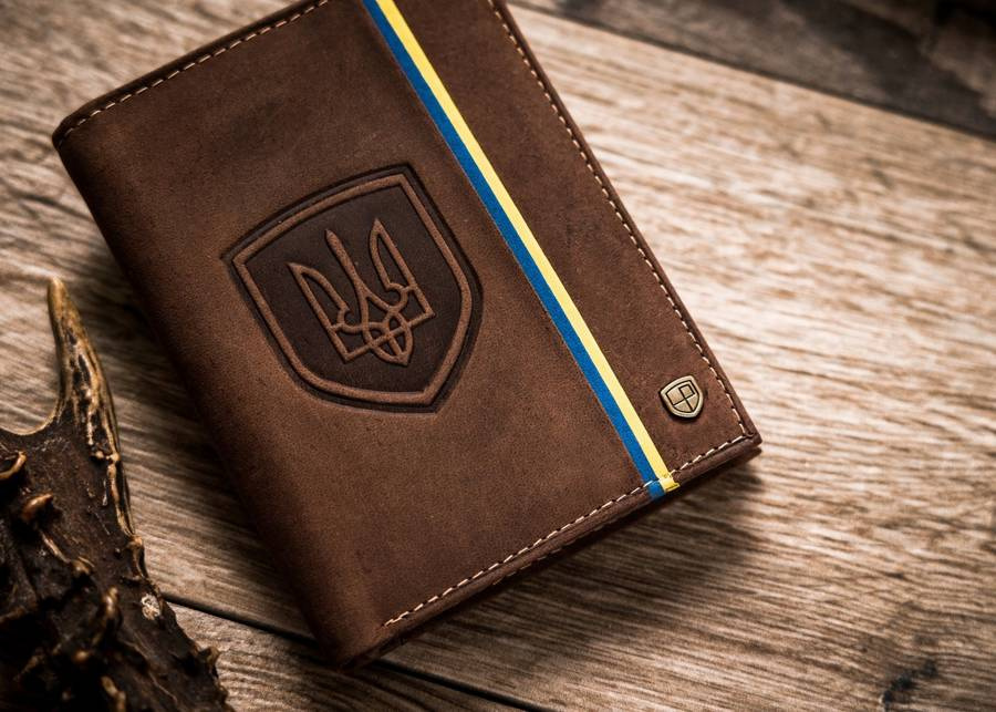 - Patriotyczny dodatek | Portfel o klasycznej stylistyce. Model w orientacji pionowej bez zapięcia zewnętrznego. Na froncie mieści się delikatny motyw niebiesko-żółtej flagi oraz wizerunek godła Ukrainy