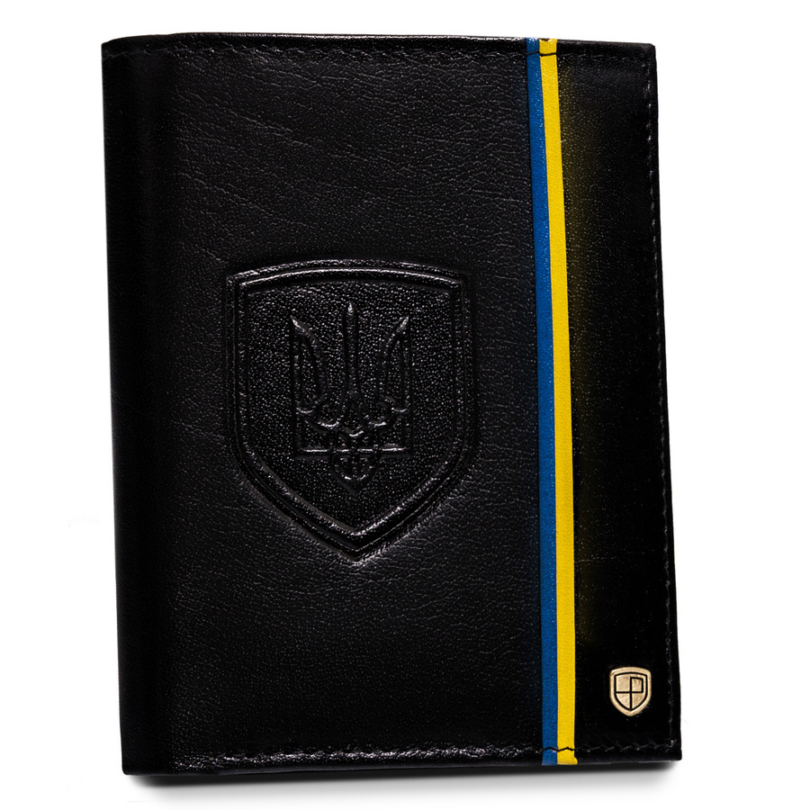 - Patriotyczny dodatek | Portfel o klasycznej stylistyce. Model w orientacji pionowej bez zapięcia zewnętrznego. Na froncie mieści się delikatny motyw niebiesko-żółtej flagi oraz wizerunek godła Ukrainy