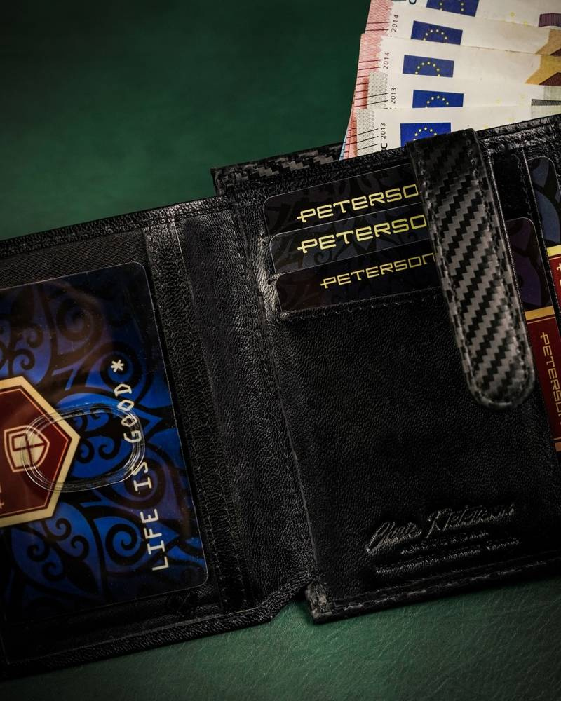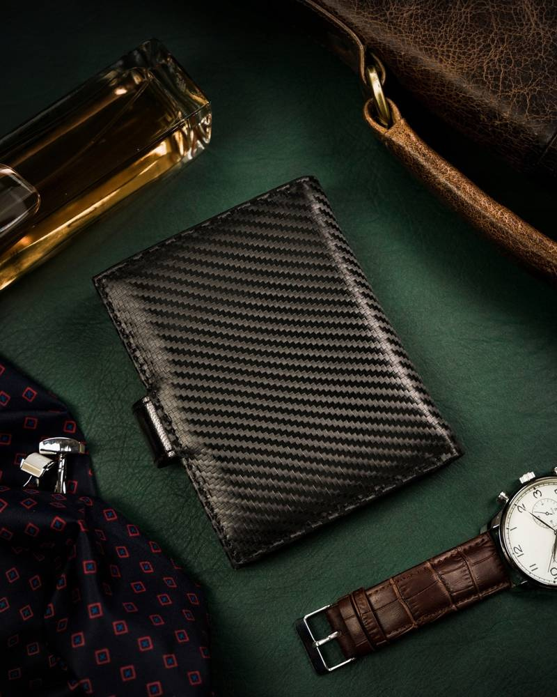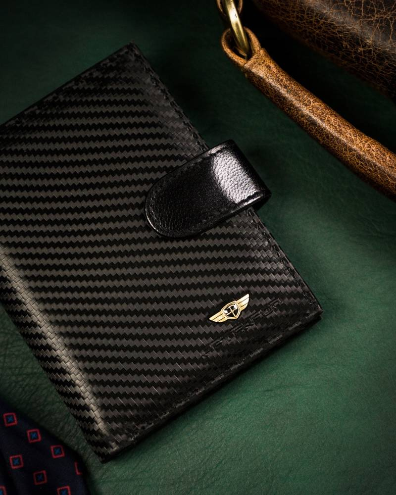 • Eleganckie wykonanie | Portfel wykonany został z wysokiej jakości skóry naturalnej powleczonej z zewnątrz warstwą do złudzenia przypominającą włókno węglowe (carbon);