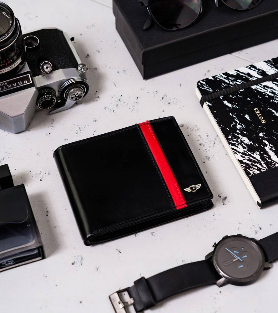 • Elegancki fason, który nigdy nie wyjdzie z mody | Czarny kolor to klasyka, a portfel w tym kolorze daje poczucie komfortu i świadomość, że możesz poczuć się modnie. Front portfela zdobi elegancki czerwony pasek