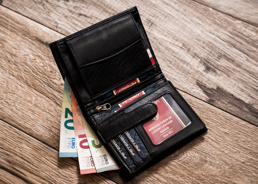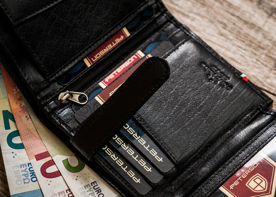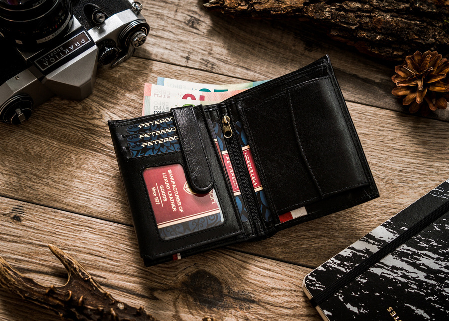 - banknoty schowasz do 2 otwartych, szerokich przegródek, wykończonych materiałową podszewką.